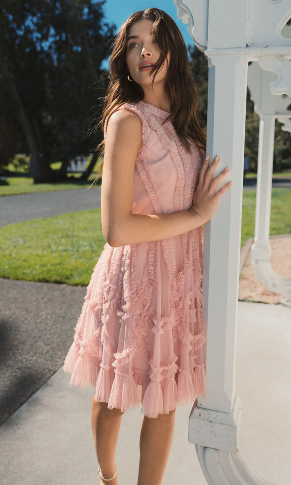Playful texture meets refined structure in this Mac Duggal 8289 sleeveless mini dress that radiates charm. The style features rows of ruffle detailing layered along the bodice and skirt, creating dimension and visual movement. A soft illusion high neckline and fitted waist enhance the flattering fit and flare silhouette. The tiered ruffle hem adds a youthful finish that is both fun and polished. Whether you are headed to a party or chic reception, Mac Duggal 8289 A-line dress is the perfect blend of whimsy and elegance. Model is wearing Rose color.