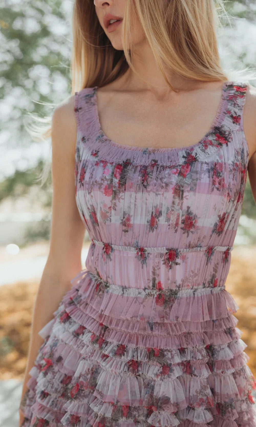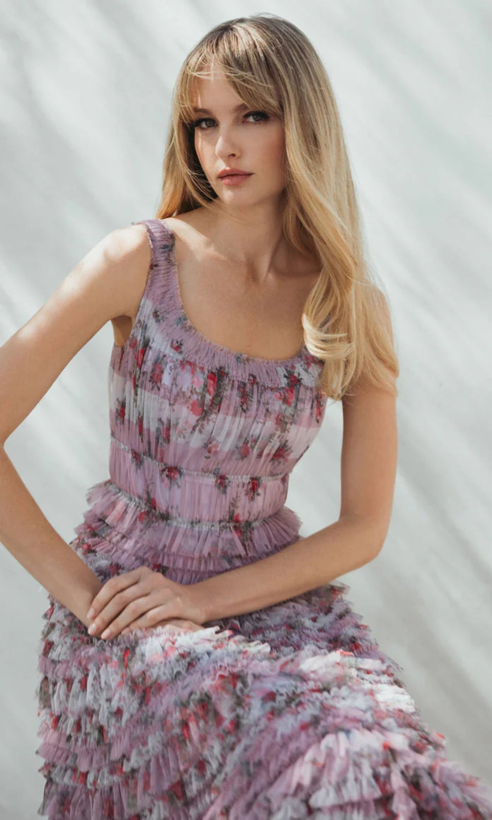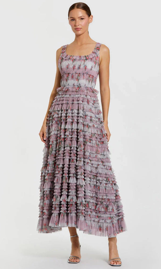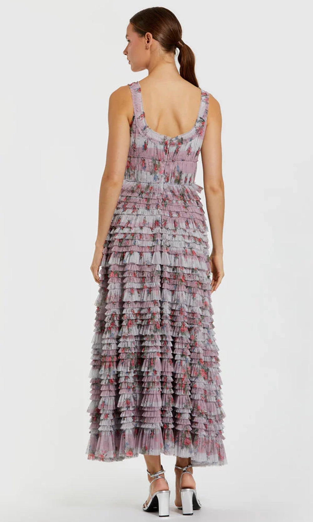 | Details: | Tiered Ruffles, Floral Print, Sleeveless Bodice, Scoop Back, Hidden Back Zipper |