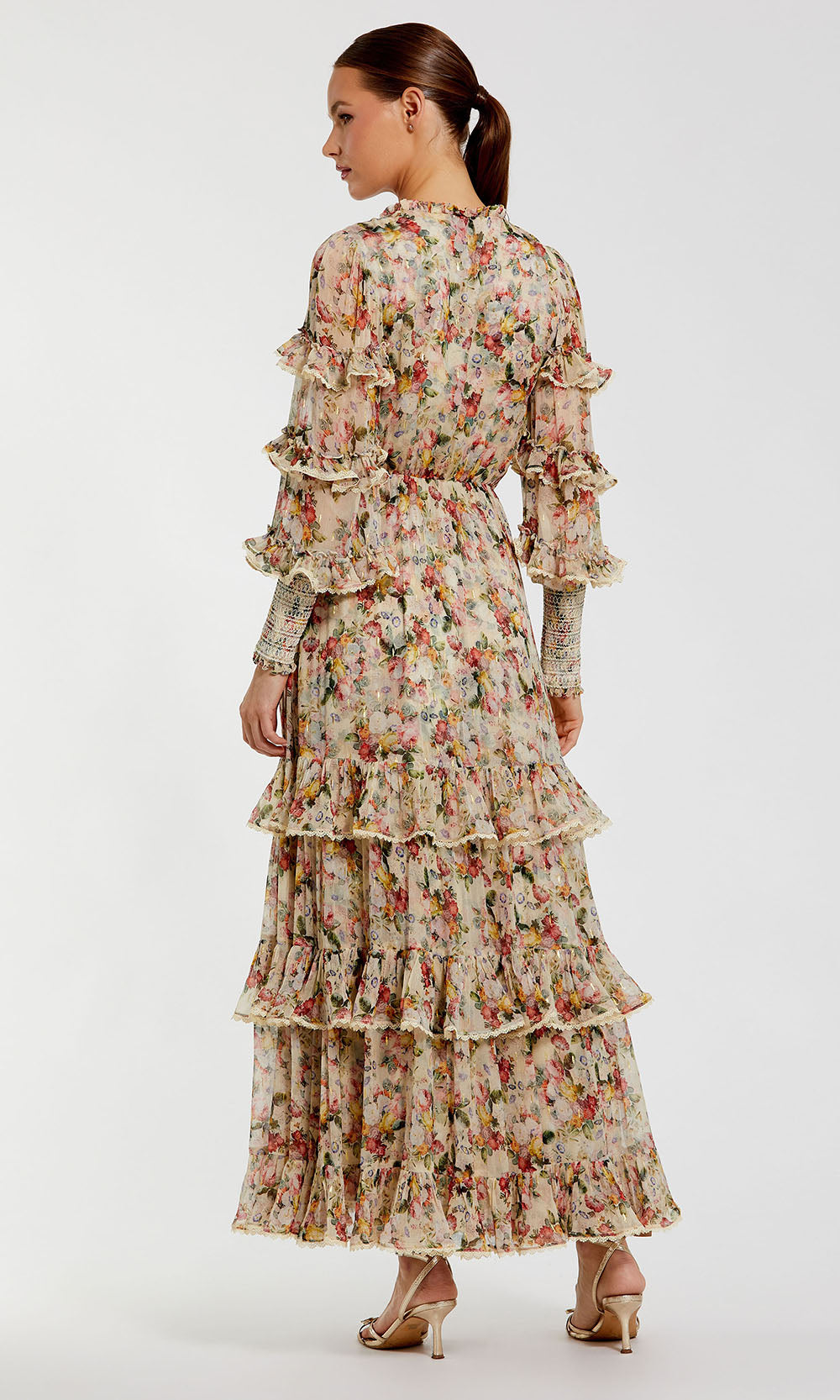 Romantic flair defines the Mac Duggal 8334, a dress infused with floral prints and timeless femininity. With a flowing A-line skirt cascading in soft ruffled tiers, the ensemble features long sleeves that offer delicate charm. The jewel neckline and full back adds modest appeal, while the natural waist ensure an elegant fit. A flourish of ruffled lace trim adds just the right amount of romance to complete the outfit. Perfect for daytime celebrations or evening soirees, the Mac Duggal 8334 delivers elegance with artistic poise for your next occasion. Model is wearing Yellow Multi color.