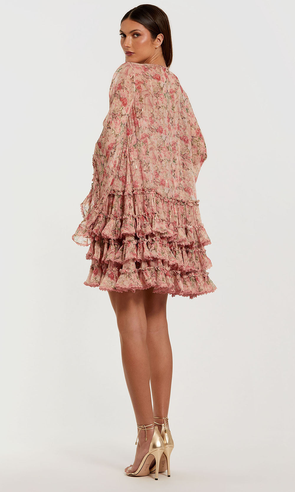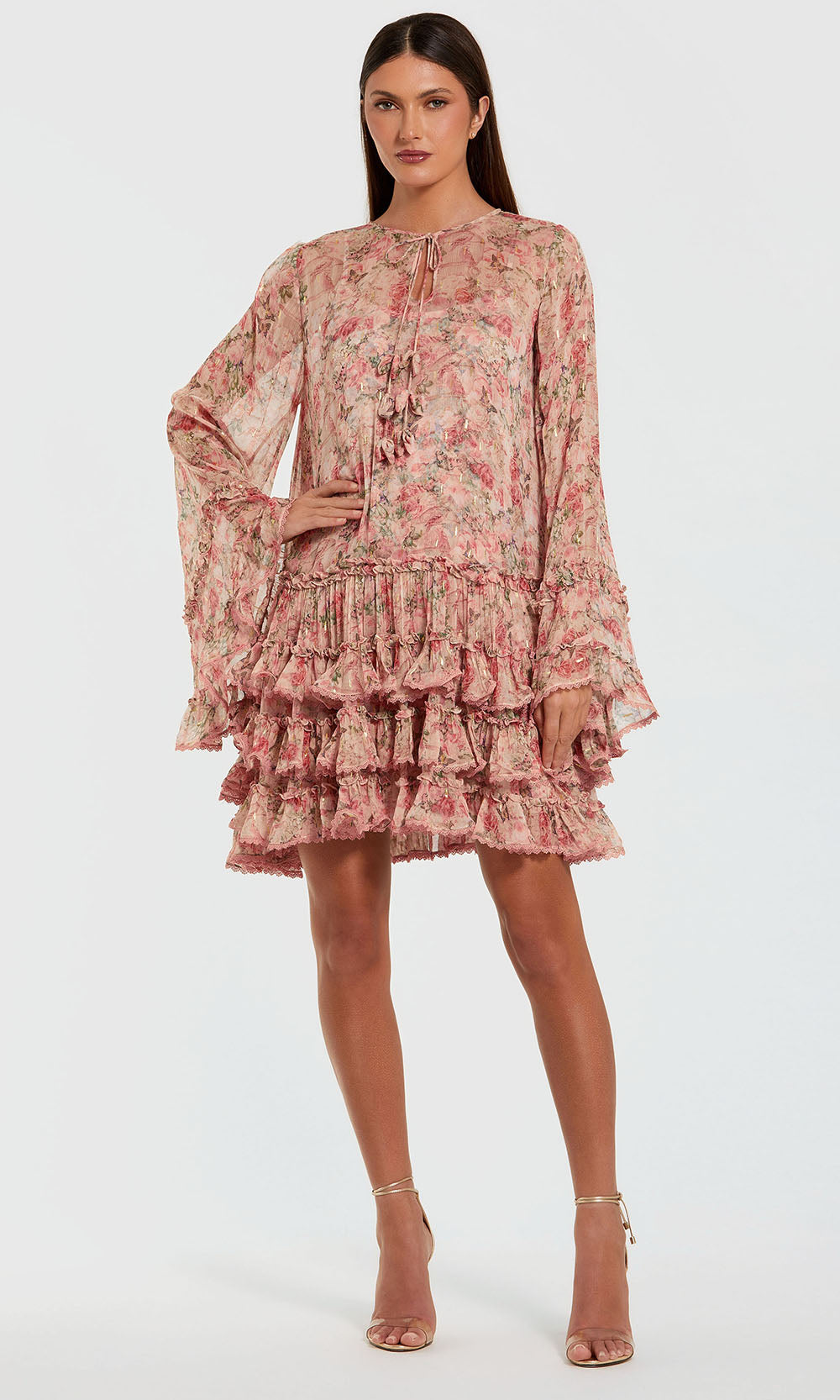 Discover the charm of the Mac Duggal 8336, a mini dress that blends elegance with a touch of whimsy. Made from gold-flecked viscose fabric, this dress features a high neckline with a stylish tie closure, adding a refined touch. The long flare sleeves and ruffle tiered A-line skirt create a playful yet sophisticated silhouette, while the full back design offer a subtle hint of allure. Fully lined through the skirt, this pullover dress ensures comfort and ease of wear. Mac Duggal 8336 style is a versatile addition to any fashion-forward wardrobe. Model is wearing Pink Multi color.
