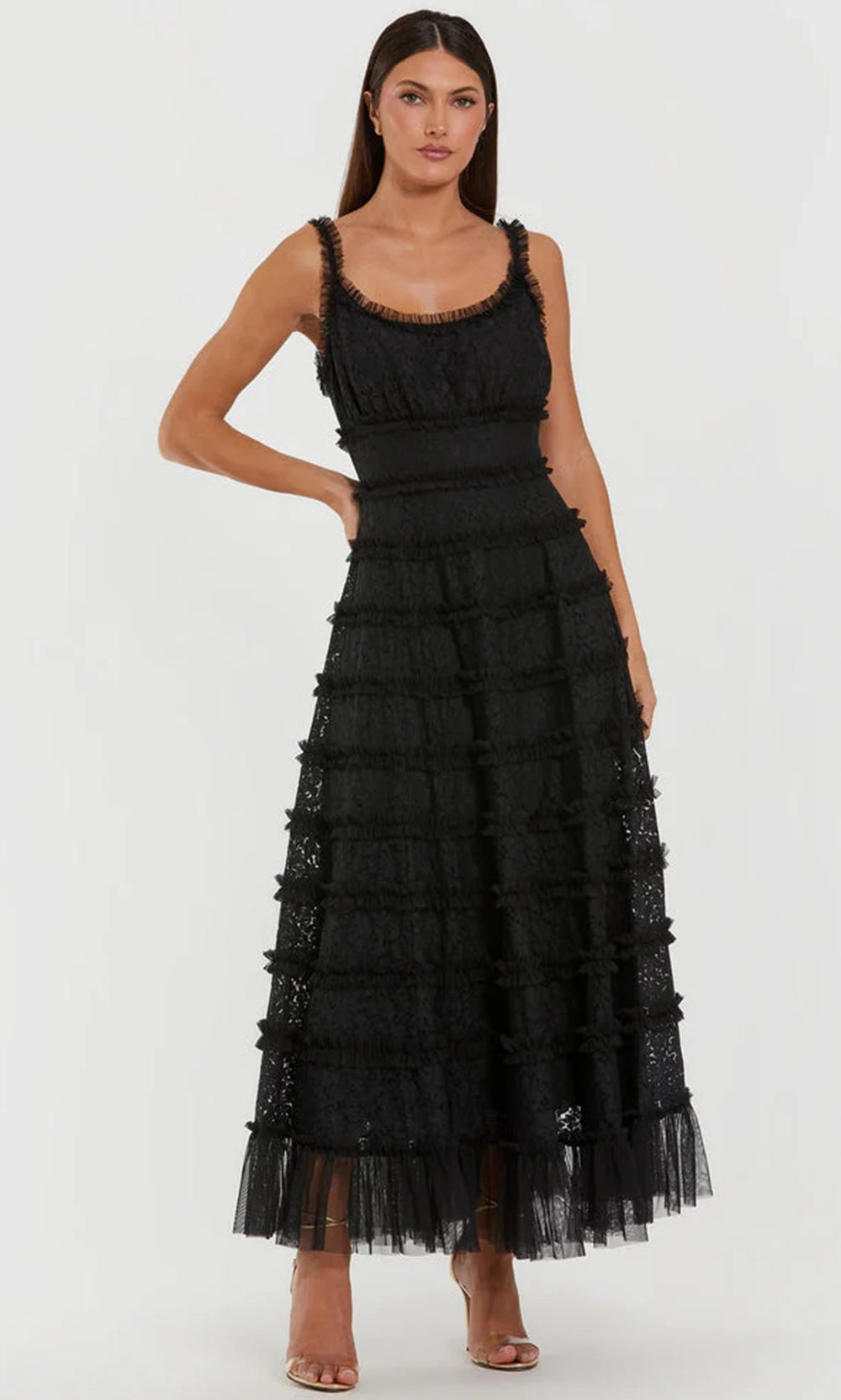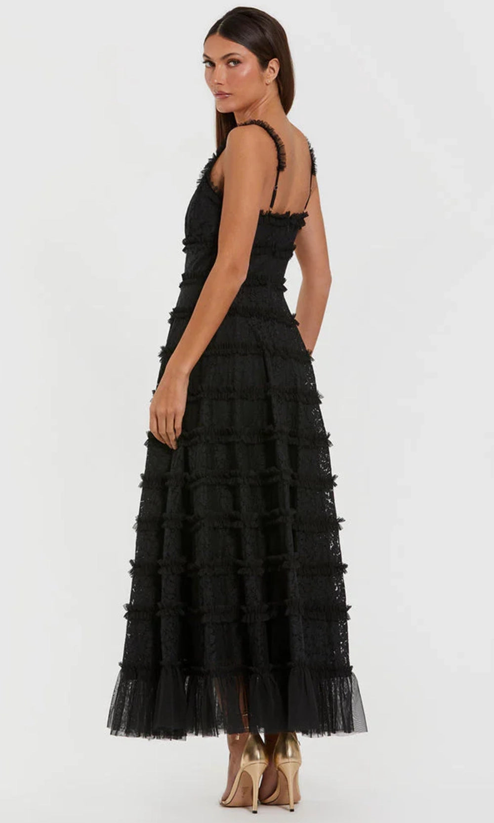 | Details: | Sleeveless, Allover Floral Lace, Ruffle Tiered, Mid-Open Back, Sheer Hem |