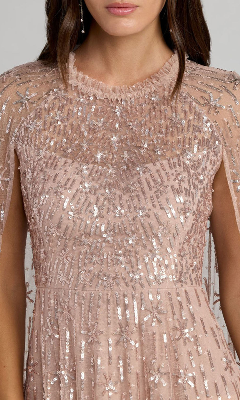 | Details: | Long Cape Sleeves, Ruffle Trim, All-Over Sequins, Concealed Back Zipper, Full-Length Hem |
