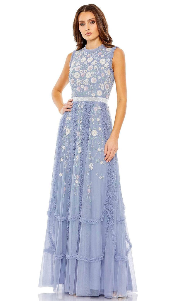 Don a style that will catapult you into the limelight in this chic Mac Duggal 9137 creation. Gorgeously designed with tailoring lines on a fully lined silhouette and overlaid with an embellished mesh, this stunner features a high neckline and trimmed with ruffle details. Donning a sleeveless bodice while flaunting spectacle of shimmering floral details, the back has a full back and a zipper closure. Nipped at the waist, the A-line skirt flaunts floral details and ruffled accents as it trails into an A-line design with a full length hem. Enchant the stylish crowd when you dramatically arrive at the ballroom in this Mac Duggal 9137 masterpiece. Models are wearing the Ivory Multi and Slate Blue Multi colors.