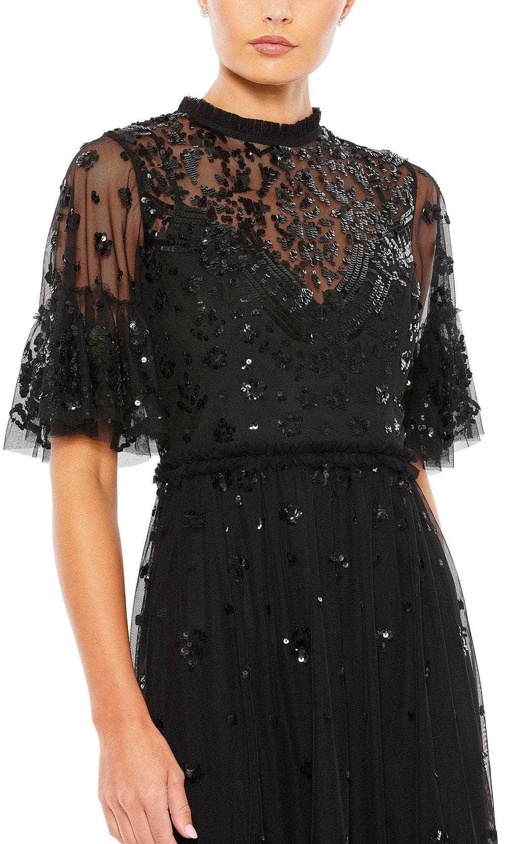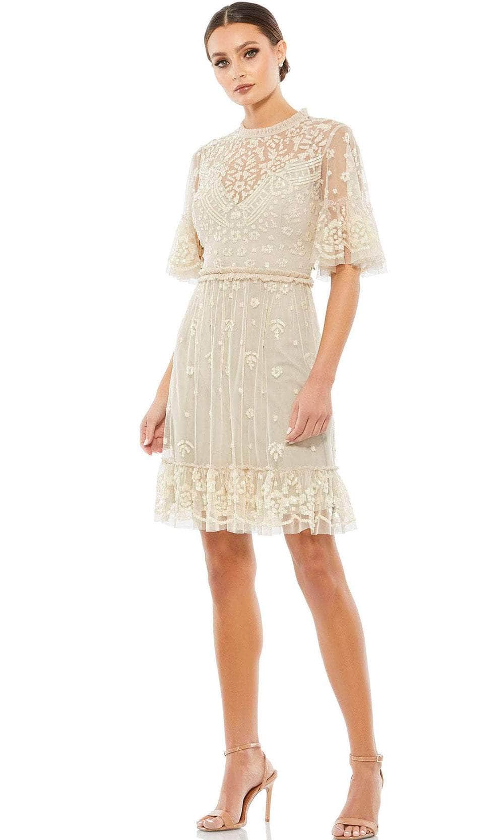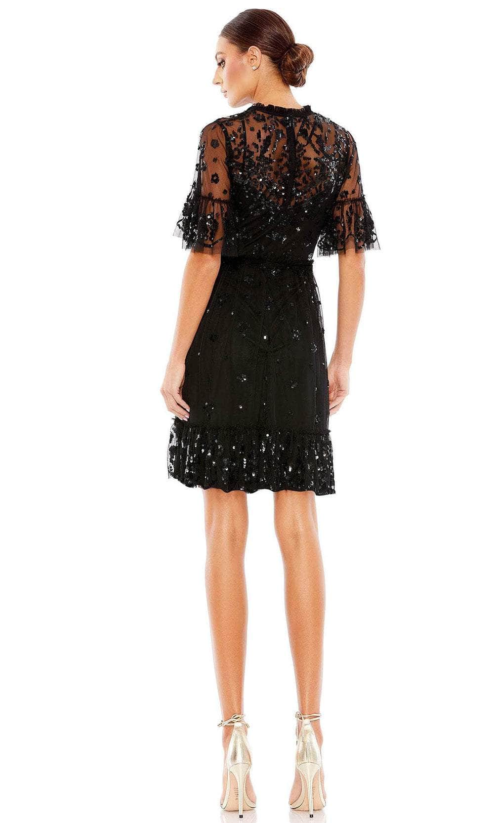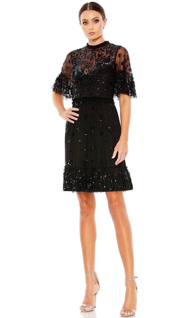 Be a woman of style and beauty in this classy Mac Duggal 9143 creation. This dress highlights a sheer flutter sleeve and a high neckline with ruffled detail. Beautiful sequin embellishment is scattered throughout the bodice. A center zipper closure secured the illusion full back while the skirt highlights a ruffle waistband for added allure. The skirt showcases a ruffle hem detail as it finishes in a short A-line silhouette. Be the ultimate belle of the party in this gorgeous dress from Mac Duggal. Models are wearing the Nude/Multi and Black colors.