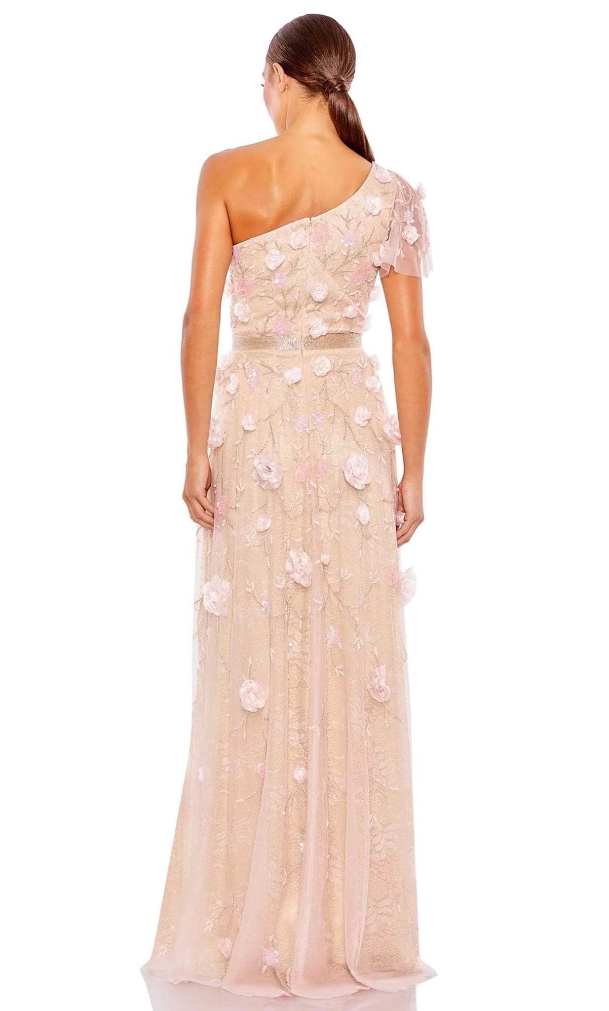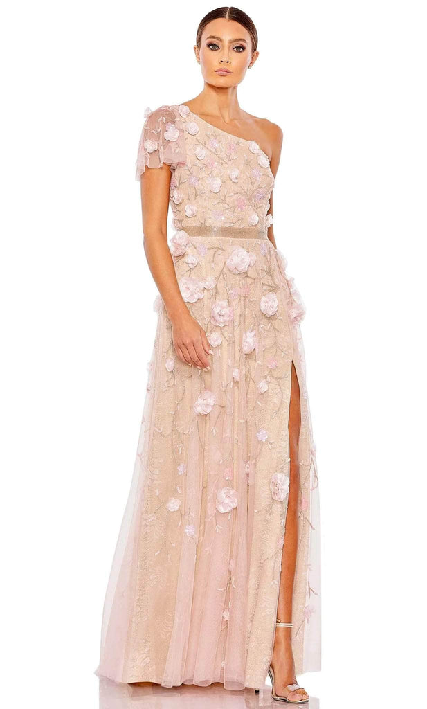 Add glamour to the mix when you don this fabulously rendered Mac Duggal 48858 creation. Gorgeously styled with a lined fabric bodice, this chic ensemble parades an asymmetrical neckline with a sheer flutter sleeve. Beautifully textured with beadwork and embellished with 3D floral appliques, the waist is ornamented with a beaded band. Opening with a sexy thigh high slit to show off those legs, the slim styled skirt flourishes an A-line silhouette with a brush of train. Claim that look of sophistication while looking like a stellar vision in this Mac Duggal masterpiece. Model is wearing the Blush Gold color.