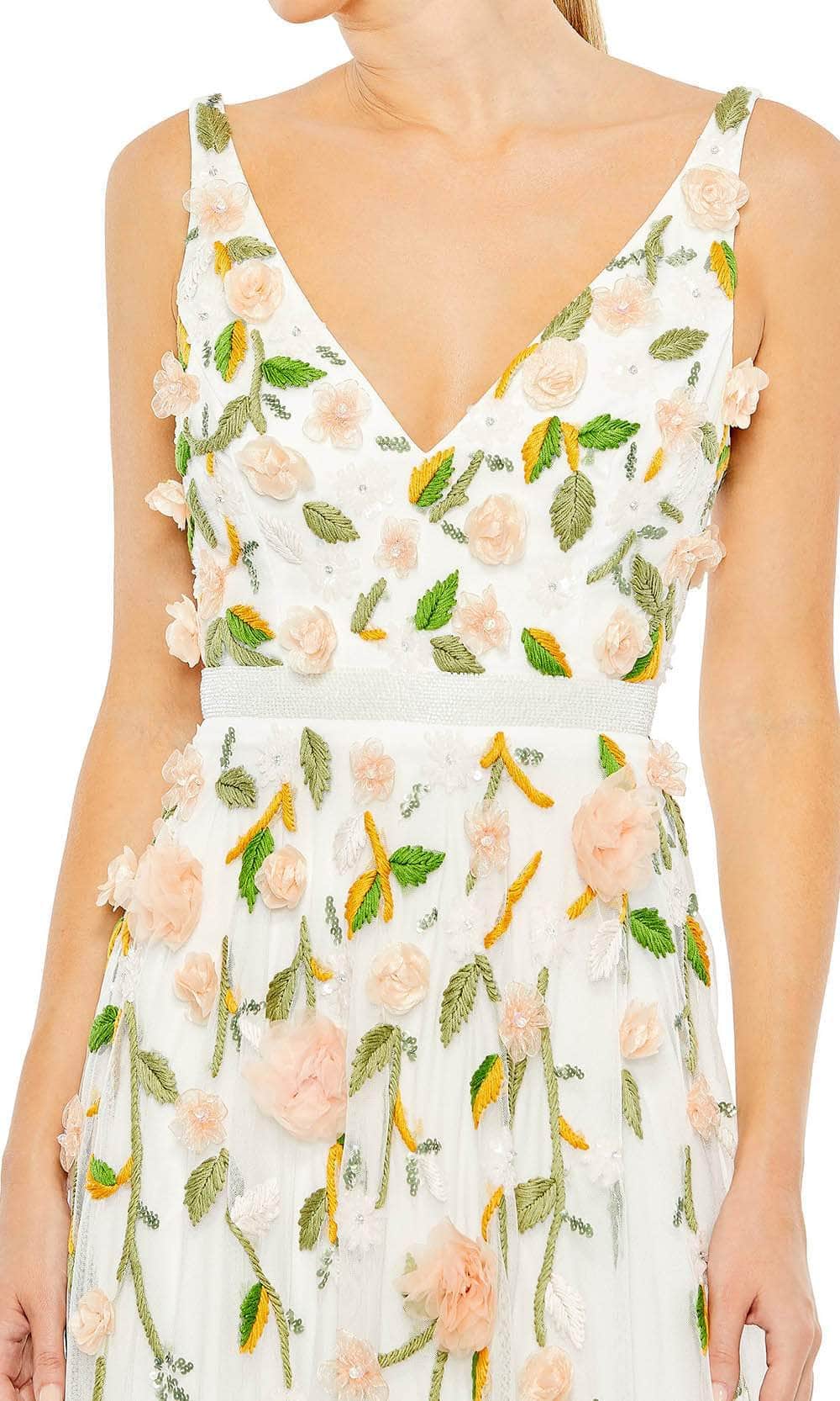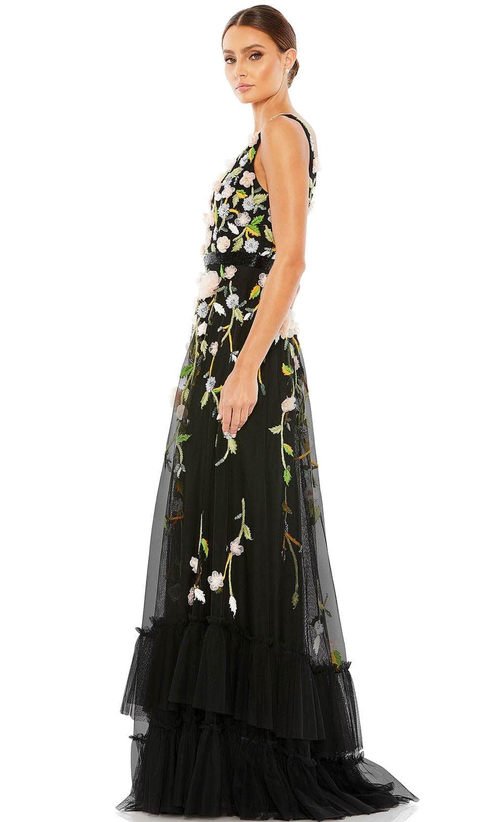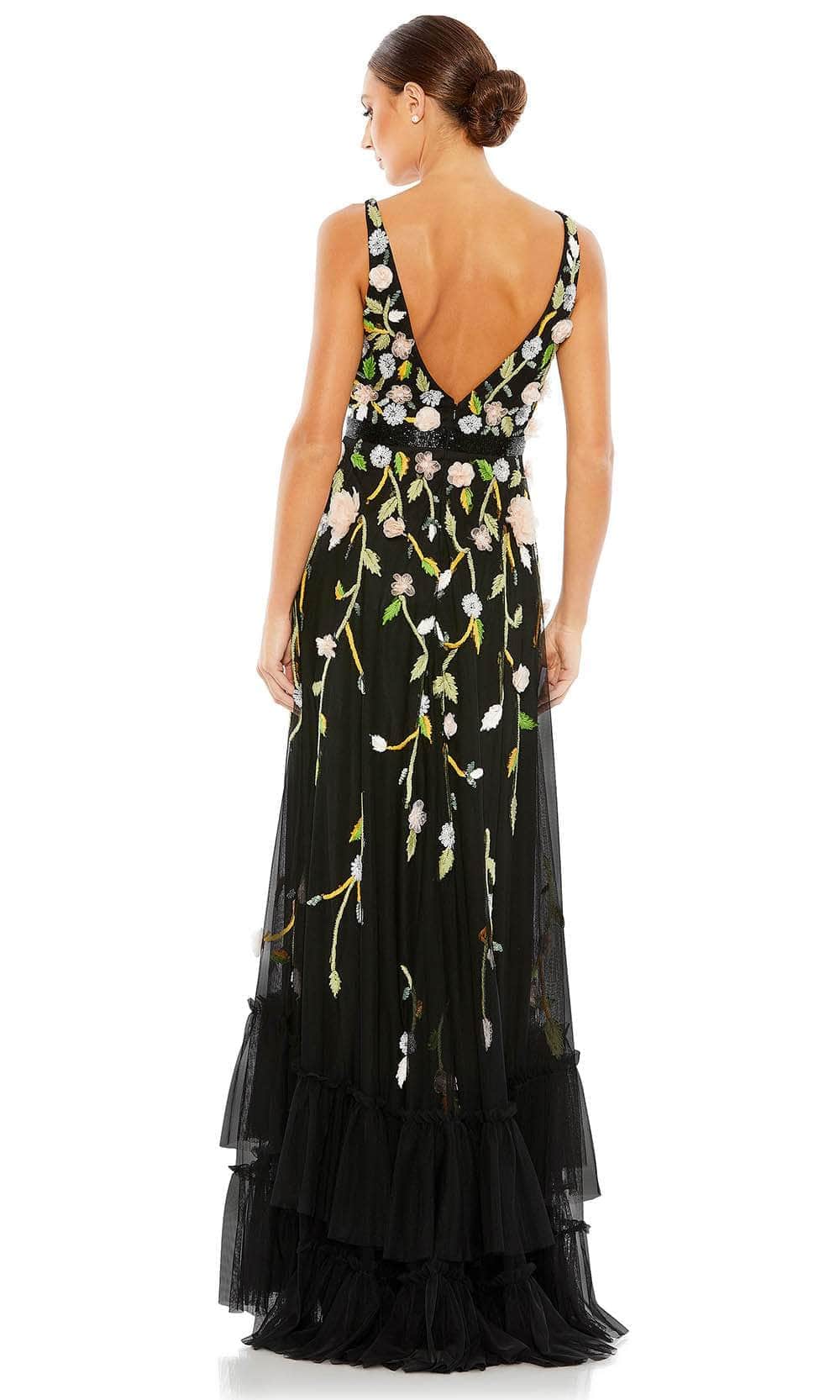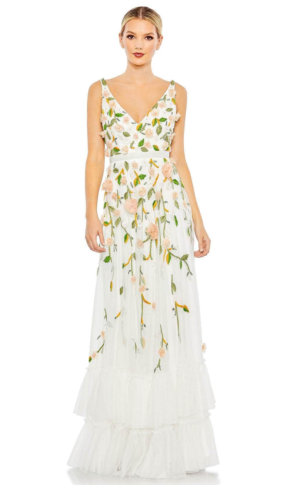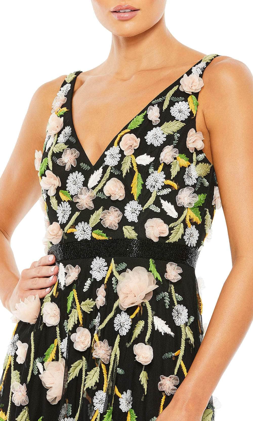Bloom with loveliness in this floral evening gown from Mac Duggal 9171. The sleeveless bodice is decorated with 3D floral appliques, sequins and embroidery in floral patterns. It displays a V neckline, open V-back and beaded waistband. The skirt is styled with a two-tiered ruffled hem and it flares into a full length A-line silhouette. You'll look fantastic in photos with a beautiful creation from Mac Duggal. Models are wearing the Black/Peach and White Multi colors.