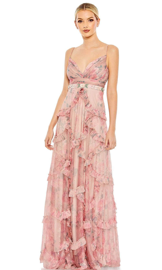 Flatter your finest assets as you enthrall the crowd in this adorable Mac Duggal 9173 creation. Fascinatingly decorated with floral prints, this sleeveless outfit flaunts a ruched top with a deep v-neckline, v-back, and spaghetti straps. The empire waist is highlighted by a wide band embellished with beaded floral appliques. Beautiful ruffles tier detailed the A-line skirt which cascades to the full length hem and exits in a slight sweep train. This Mac Duggal 9173 gown upholds attention-grabbing style at your upcoming event! Model is wearing the Rose Pink color.