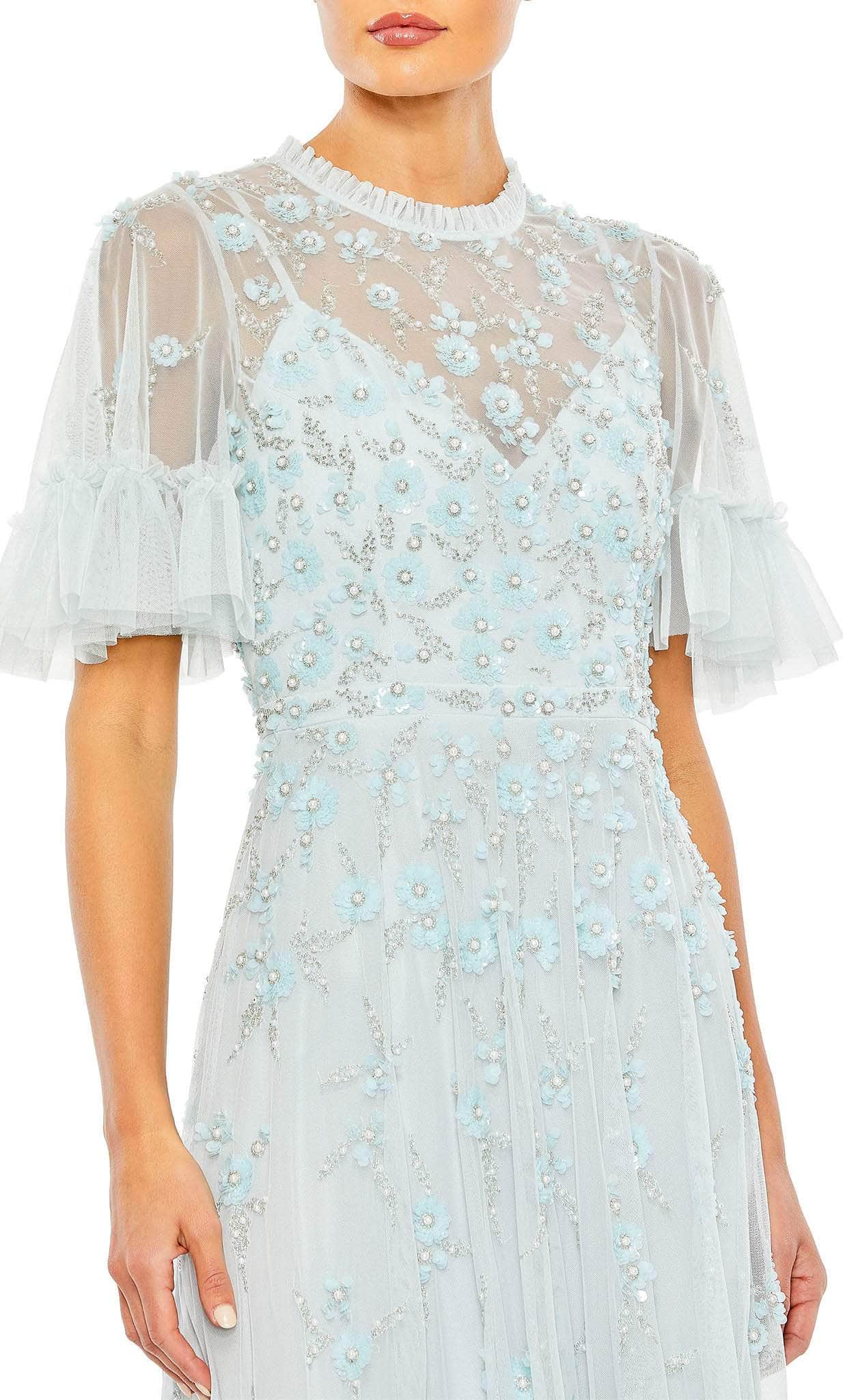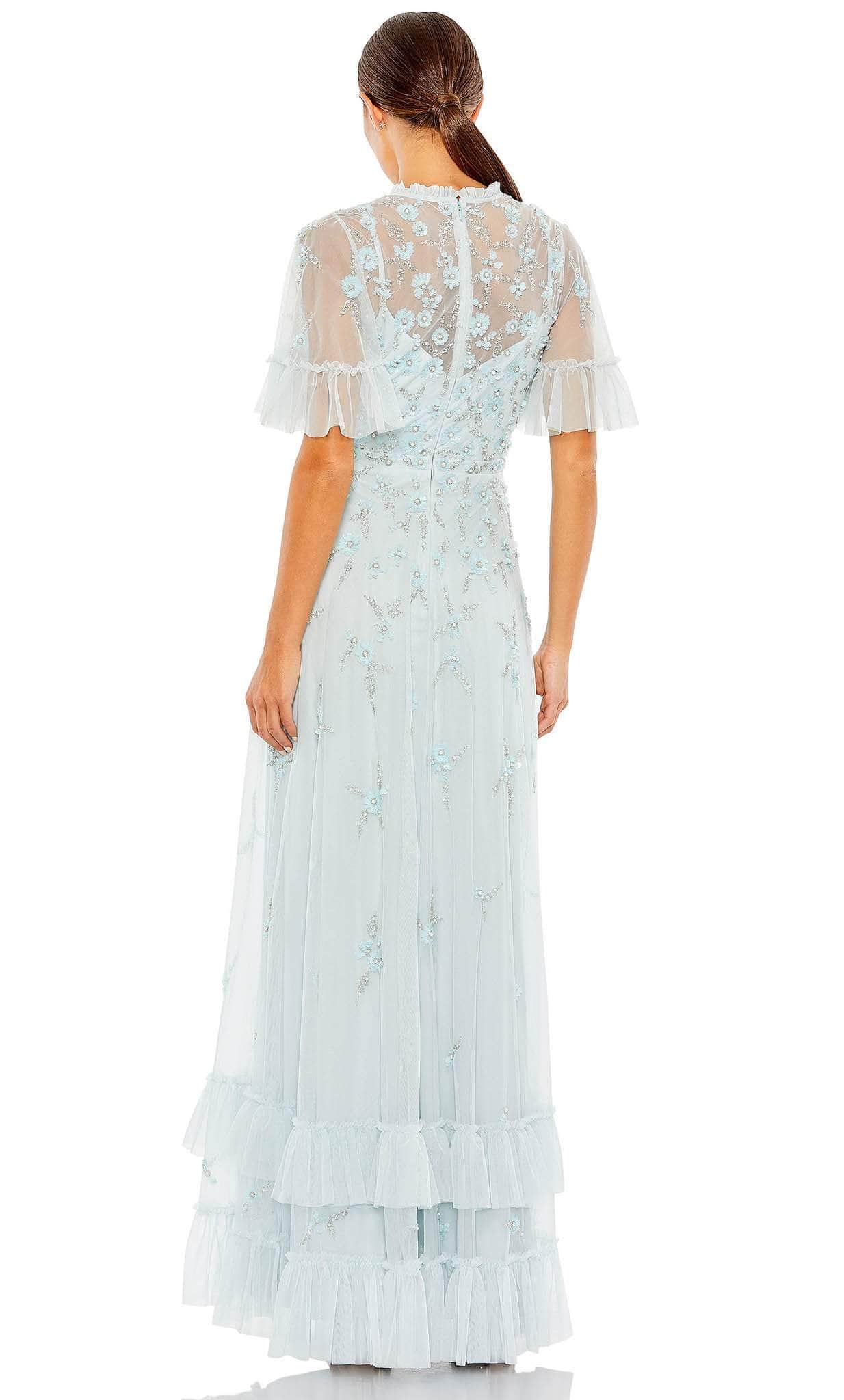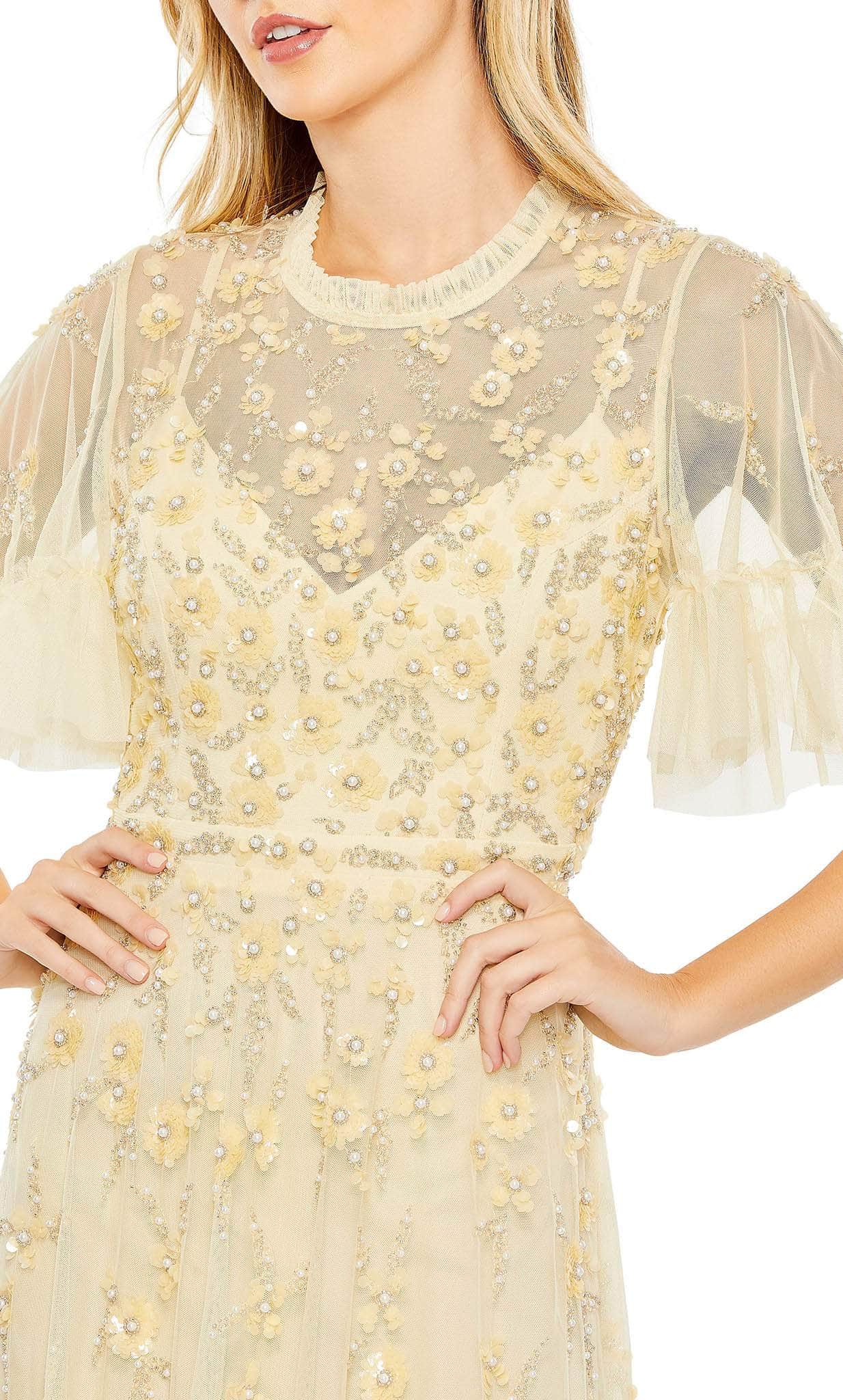 Feel gorgeously empowered in this magnificent Mac Duggal 9199 masterpiece. Beautifully embellished with beads in a floral design, this dress features an illusion high neckline, short flutter sleeves, and a fully enclosed back that has a center zipper closure. Gathered from the waist, the full-length skirt parades in an A-line silhouette fashion a ruffled tiered skirt. This fabulous design by Mac Duggal 9199 brings a striking look meant to turn heads. Models are wearing Black, Butter Cup and Powder Blue colors.
