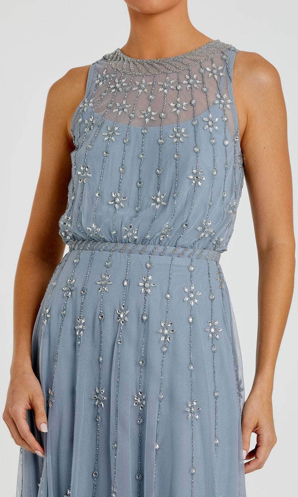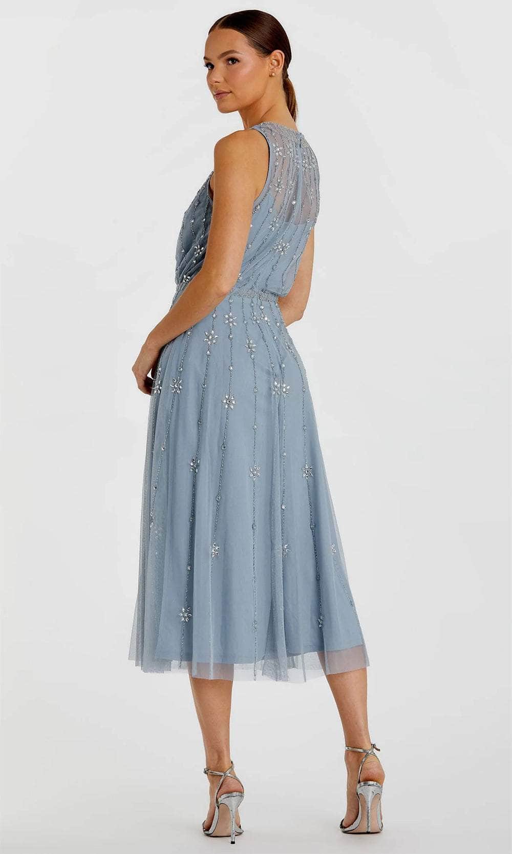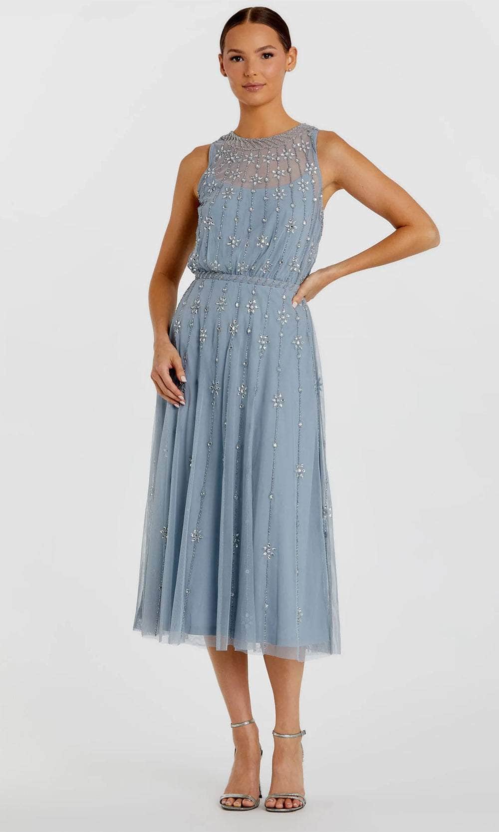 Wrap yourself in the ethereal charm and beauty of this Mac Duggal 9222 masterpiece. Designed to enchant from all angles, this sleeveless dress sparkles with beads arranged in linear and floral motifs. Features are a jewel neckline with delicate illusion detail and partial illusion back. The thin beaded waistband creates a flattering shape. As the skirt descends to the tea-length hemline, it sculpts an A-line silhouette that adds a touch of romance and flatters all shapes. This Mac Duggal 9222 dress is the perfect choice to make any occasion unforgettable. Model is wearing Powder Blue color.