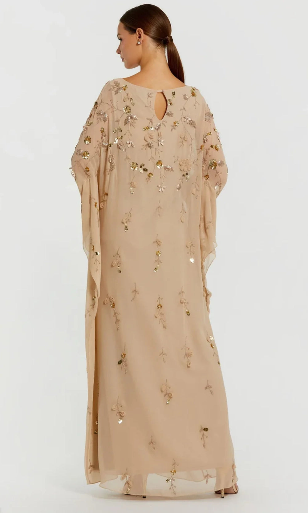 The Mac Duggal style 9242 is a timeless long chiffon gown featuring a boat neckline, long sleeves, and a flowing cape overlay. Its floral embroidery adds a romantic touch, making it ideal for formal occasions. The concealed back zipper ensures a flawless fit. Elevate your style with the Mac Duggal 9242, perfect for creating unforgettable memories. Model is wearing the NudeGold color.