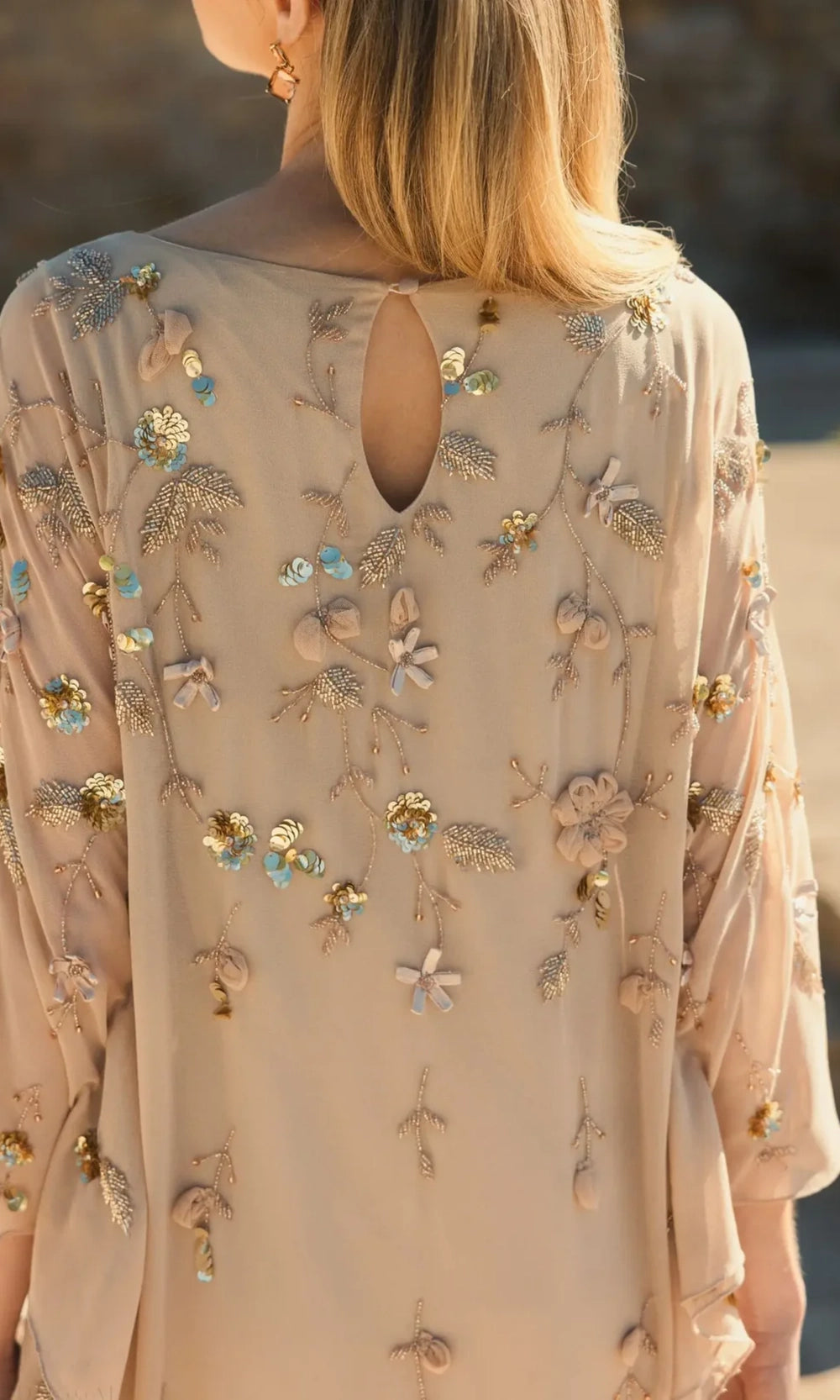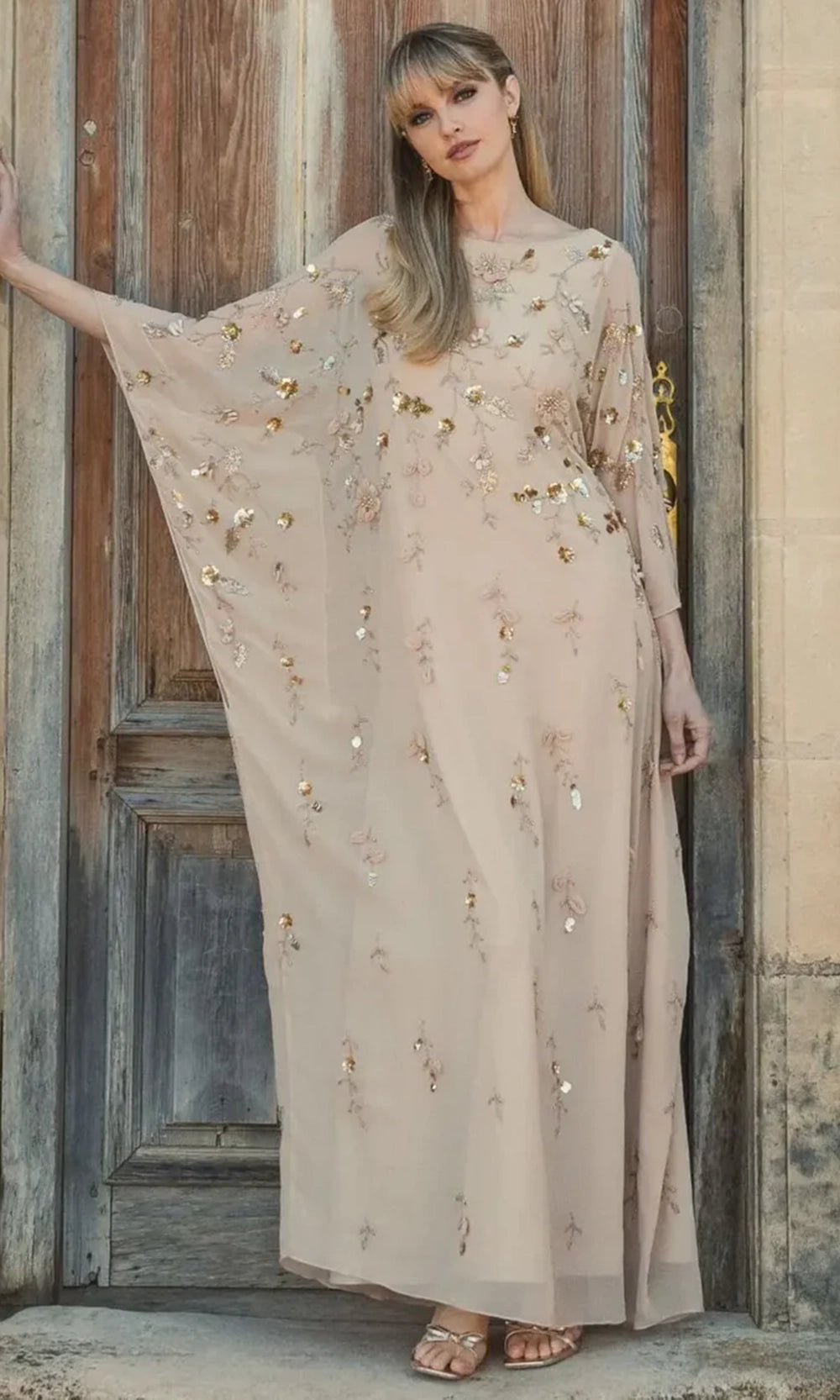 | Details: | Boat neckline, long sleeves, flowing cape overlay, concealed back zipper |