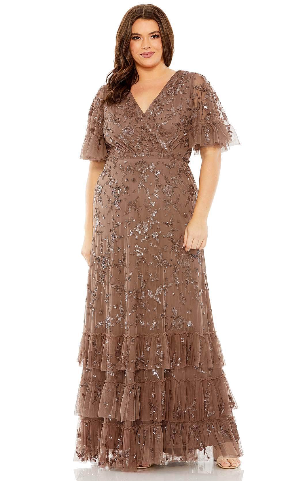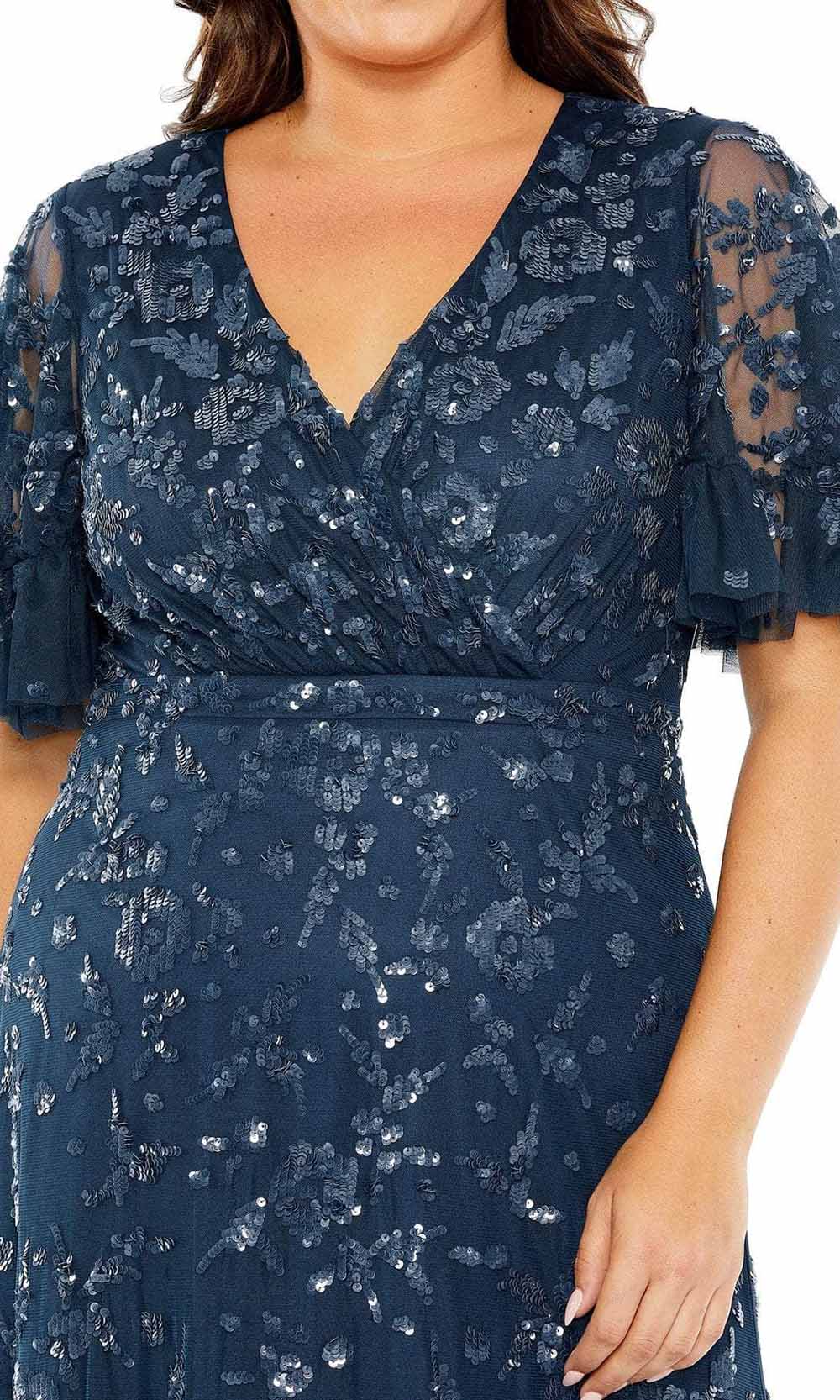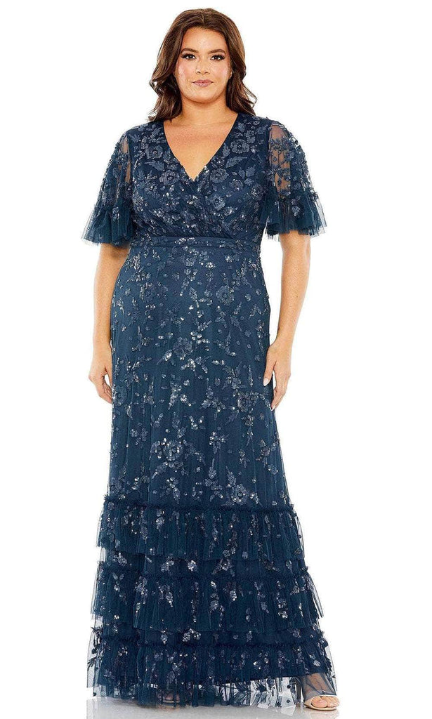 Look ravishing in this luxurious Mac Duggal 9270 gown. Featuring a decadent V neck neckline and short flutter sleeves, this column dress is exquisitely embellished with floral embroidery and shimmering sequins for a hint of sparkle. Perfect for a special night out, this gown will make you feel like a timeless goddess. Models are wearing the Twilight, and Chocolate colors