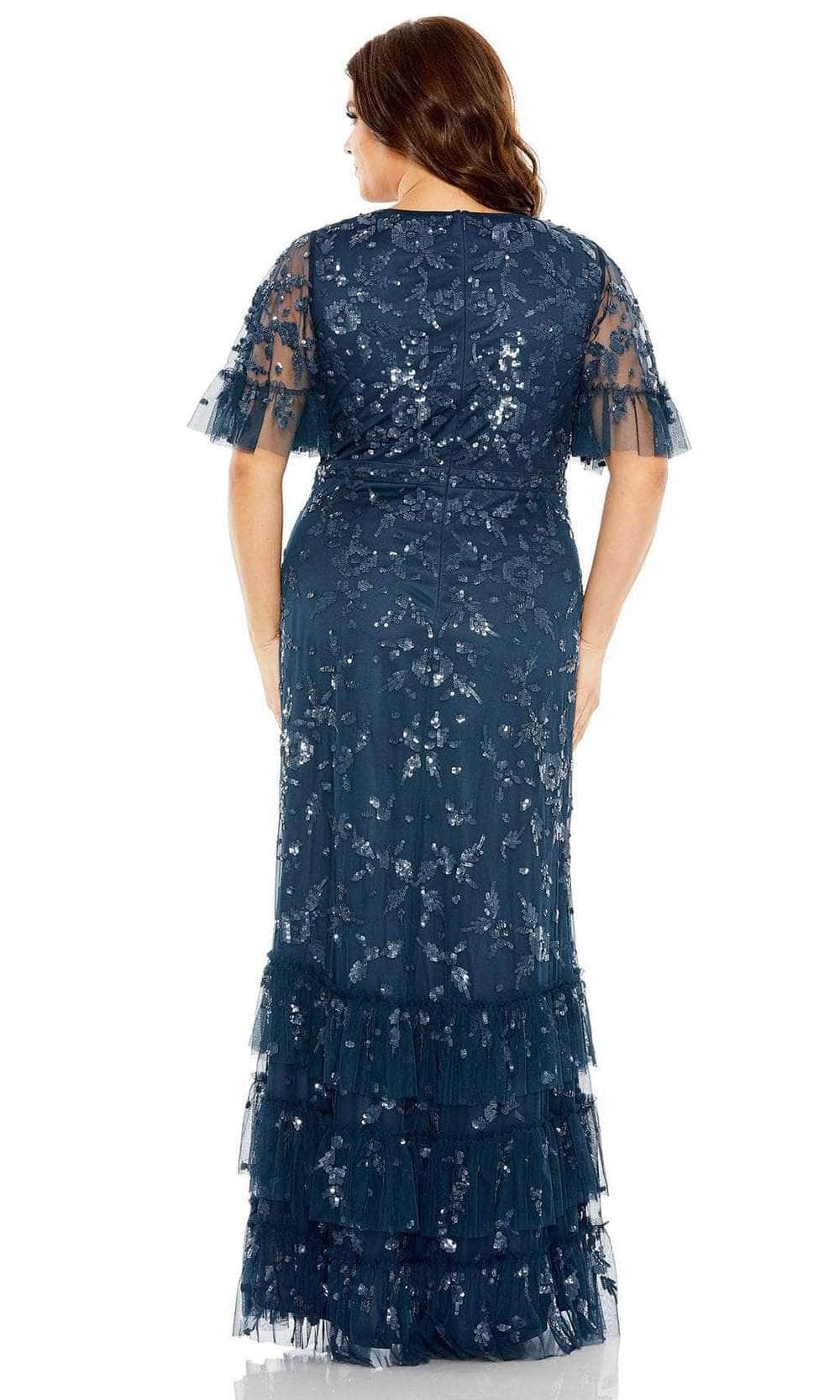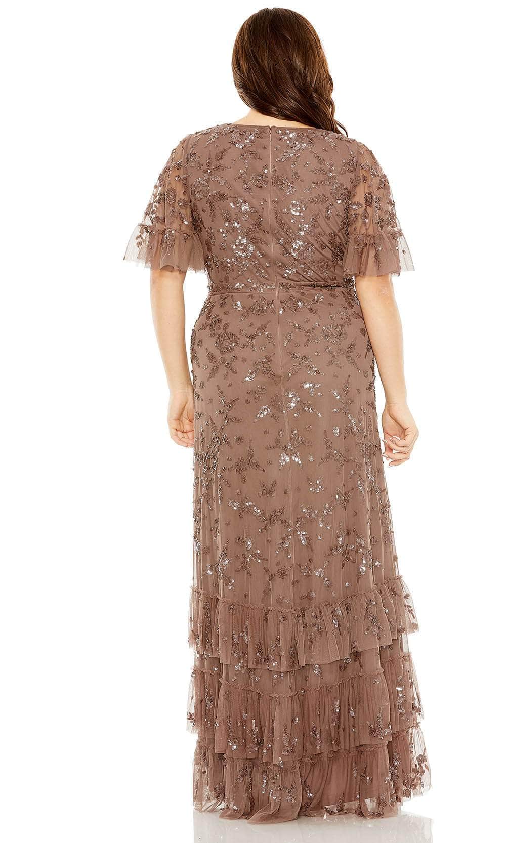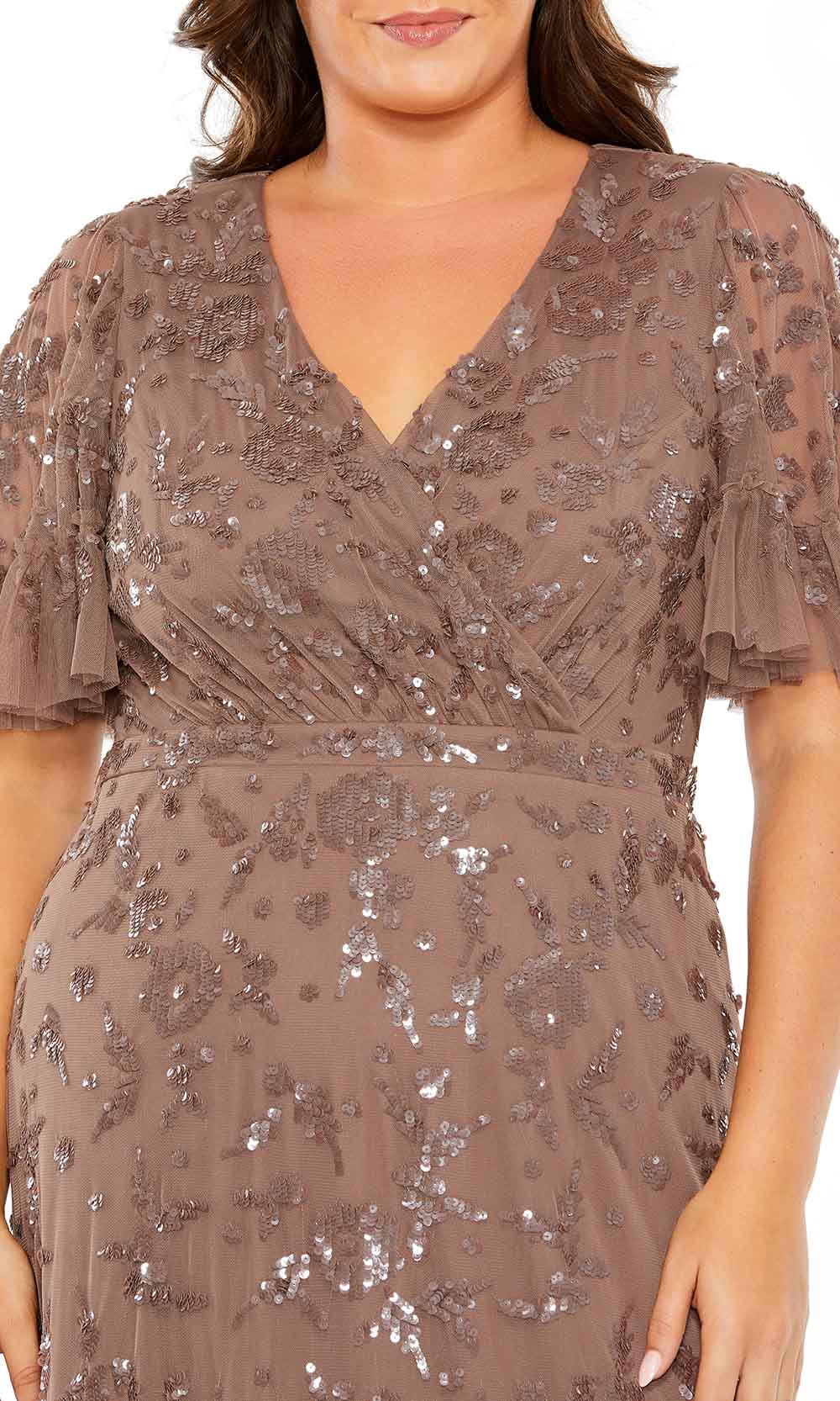 Look ravishing in this luxurious Mac Duggal 9270 gown. Featuring a decadent V neck neckline and short flutter sleeves, this column dress is exquisitely embellished with floral embroidery and shimmering sequins for a hint of sparkle. Perfect for a special night out, this gown will make you feel like a timeless goddess. Models are wearing the Twilight, and Chocolate colors