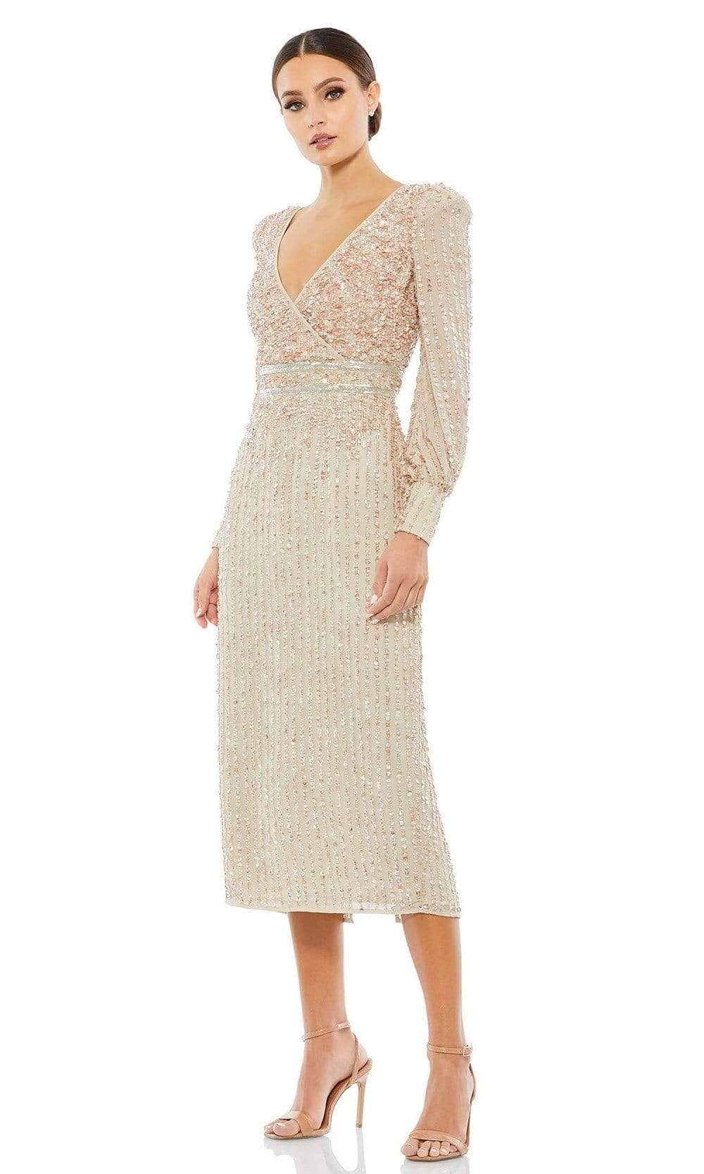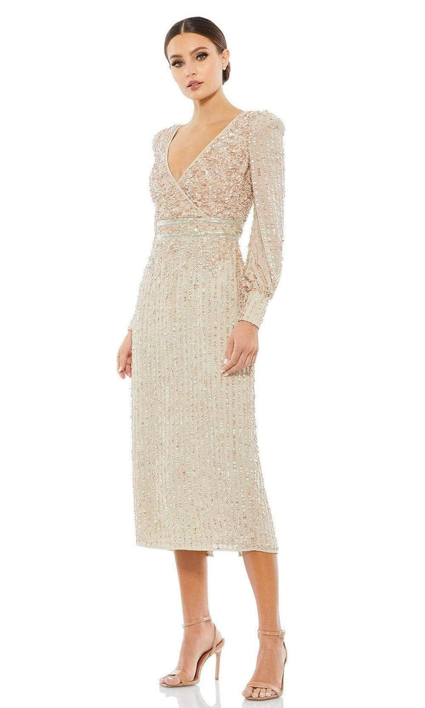 Dress to impress on your next formal event in this captivating Mac Duggal 93593. Lavishly adorned in gradated two-tones sequins, this midi dress follows a classic sheath silhouette. The faux wrap bodice is framed by long blouson sleeves with padded shoulders. This Mac Duggal creation is simply breathtaking!