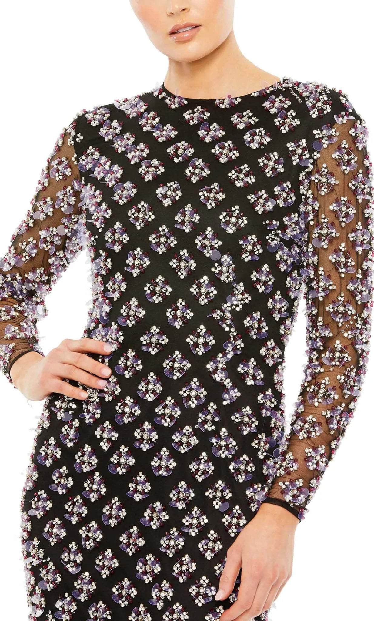 Surround yourself with decadence in a dazzling Mac Duggal 93618. Sparkle from head to toe in this elegant long sleeved gown, adorned with a gorgeous pattern of hand-sewn sequins, beads, and rhinestones throughout. It offers a statuesque grace with a jewel neckline and a modest column silhouette. The sleer long sleeves are sewn with sheer fabric with a similar pattern as the bodice. Look sophisticated and mature in this simple yet chic Mac Duggal 93618 Model is wearing Black color.