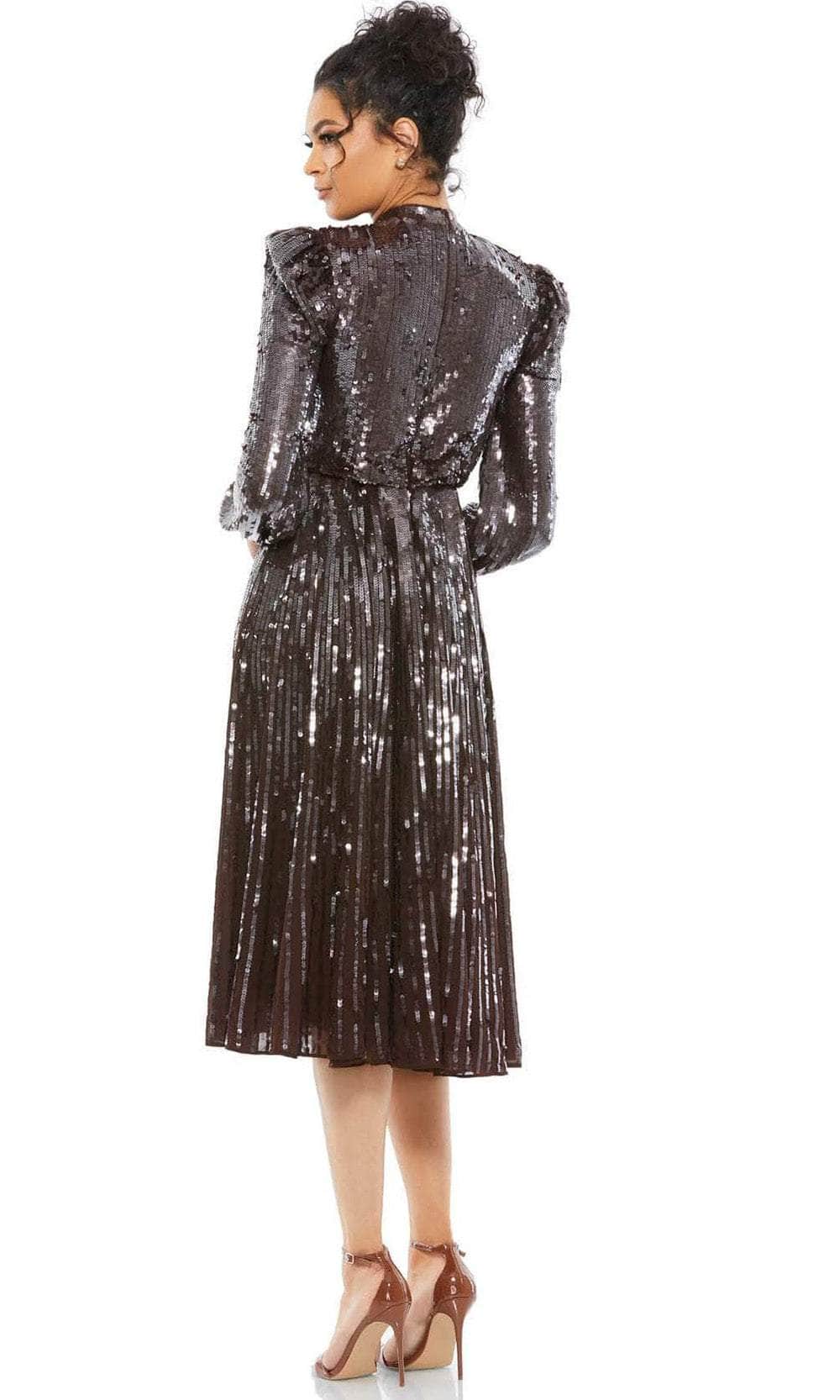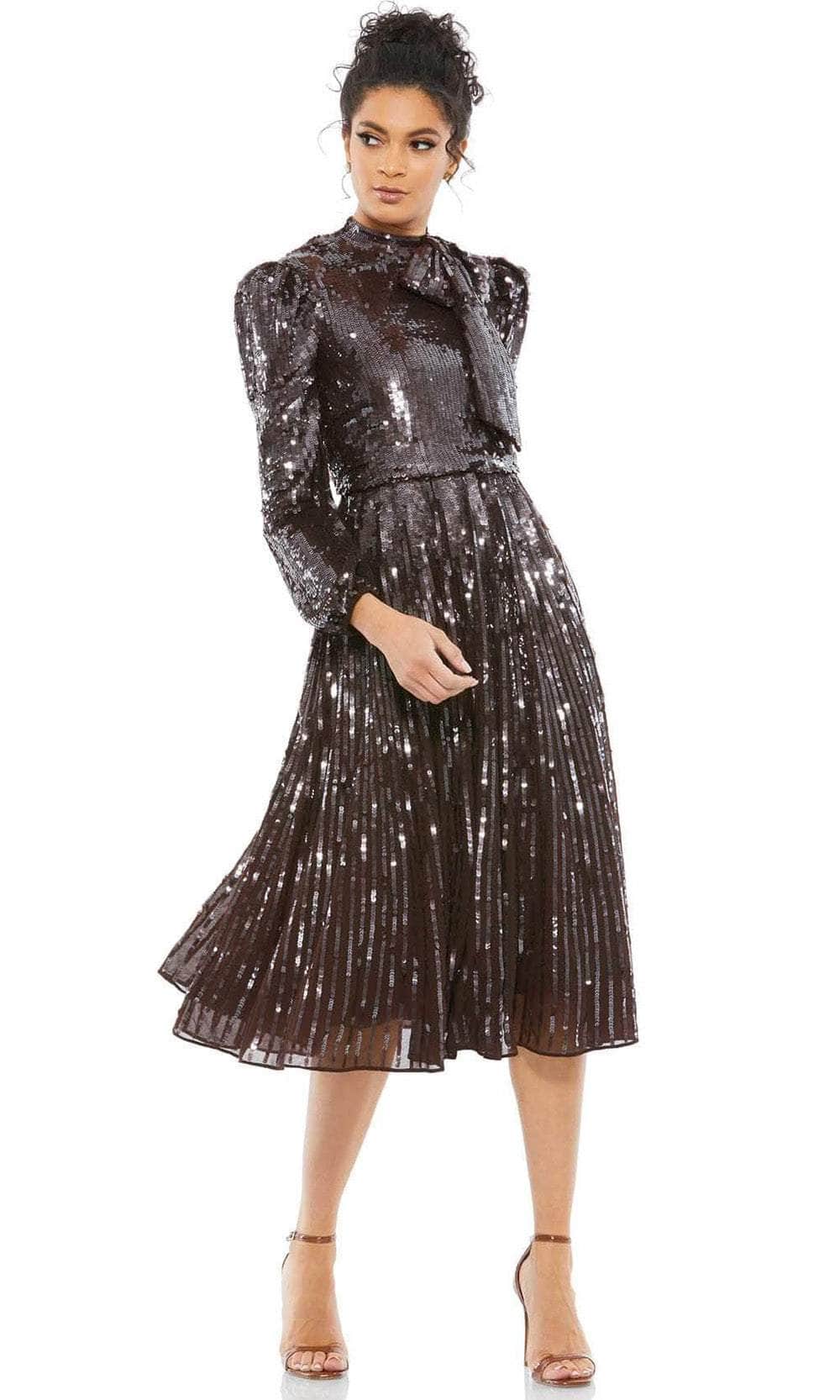 Sparkle like royalty in this tantalizingly elegant Mac Duggal 93642 creation. Fully embellished with trailing sequins allover its length,  this stylish dress shows off a high neckline with a bow accenting jauntily ornamenting one side. Long bishop sleeves are designed with subtle puff accents on the shoulders. The A-line skirt flashes as it flares into a below the knee hemline. Turn yourself into a head-turning beauty by slipping into this Mac Duggal masterpiece. Model is wearing the Dark Chocolate color.