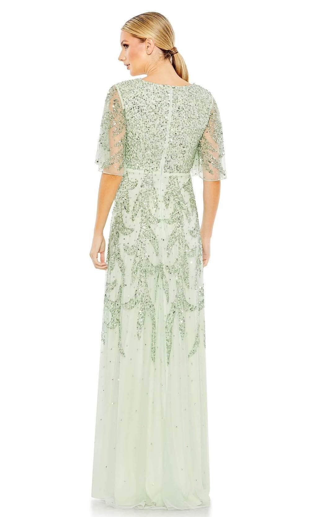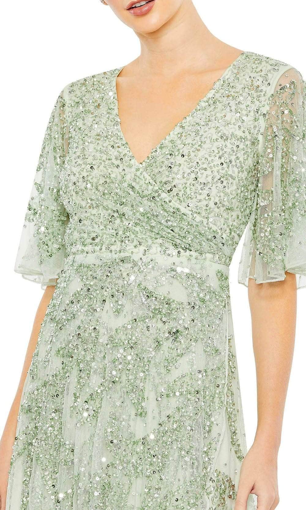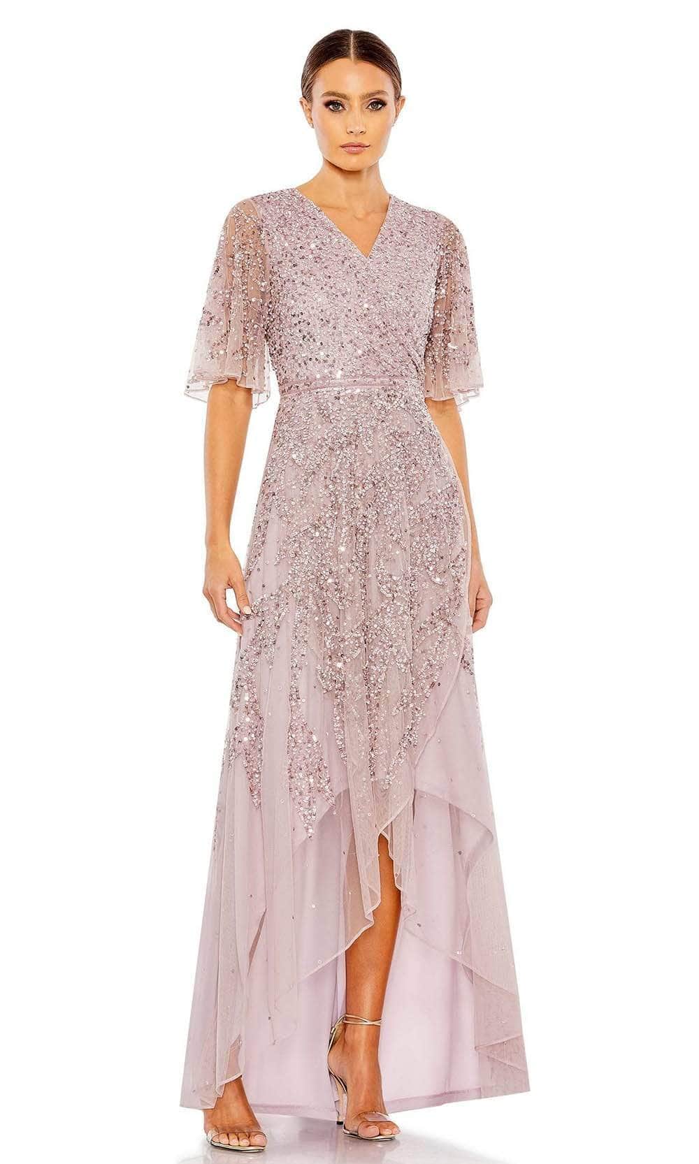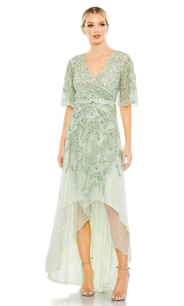 Have a blast in this fashionable Mac Duggal Couture 93681 dress. The sheer bodice is modestly covered with stunning sequin embellishment and is topped with elbow sleeves and a V neckline in a surplice style bodice. The full back is enclosed with a zipper closure. The A-line skirt cascades beautifully to a high low hemline with sheer overlay for a dramatic look. This Mac Duggal creation will absolutely make you feel special!