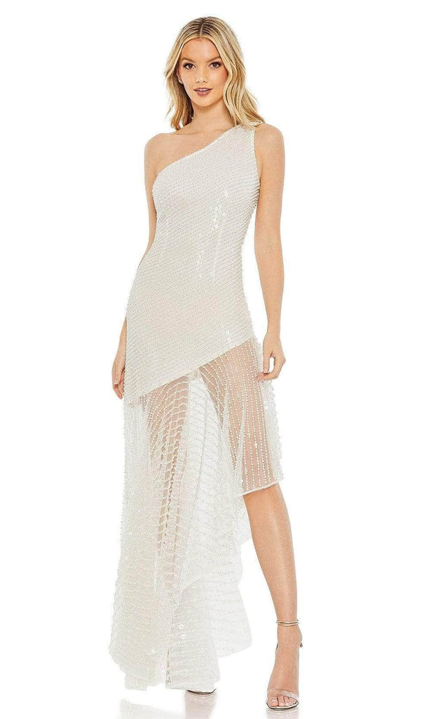 Create the illusion of sophistication in this Mac Duggal 93741 creation. Exceptionally rendered with pearl-beadwork, this gown flatters with a one shoulder neckline and a partial open back. The trumpet skirt skims and flares into a high low hemline. Liven up the party in this exquisite Mac Duggal masterpiece.