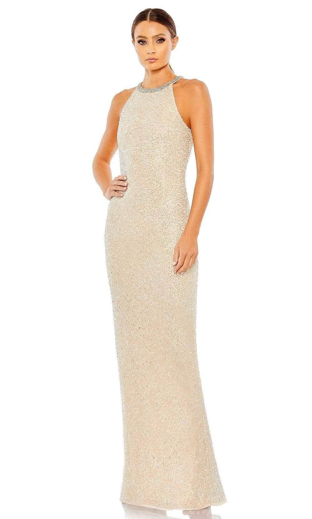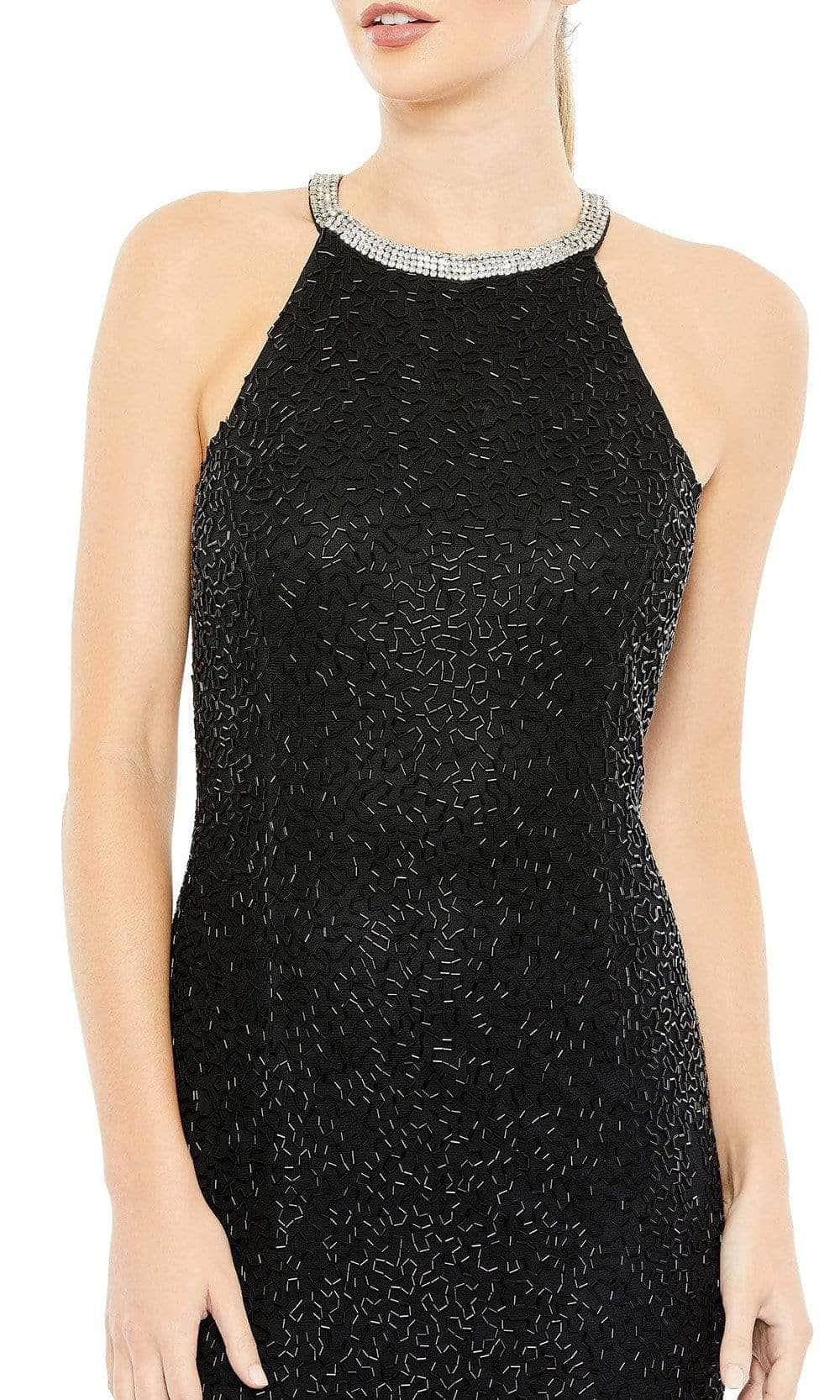 Make waves as you enter the party in this Mac Duggal 93742 creation. Exquisitely embellished with beadwork allover its length, this halter gown shows a crust of twinkling jewels along the neckline. Crafted with a racerback, the sheath skirt parts with a back slit before pooling into a floor length hem. Upstage everyone in this Mac Duggal masterpiece. Find more Black Prom Dresses.