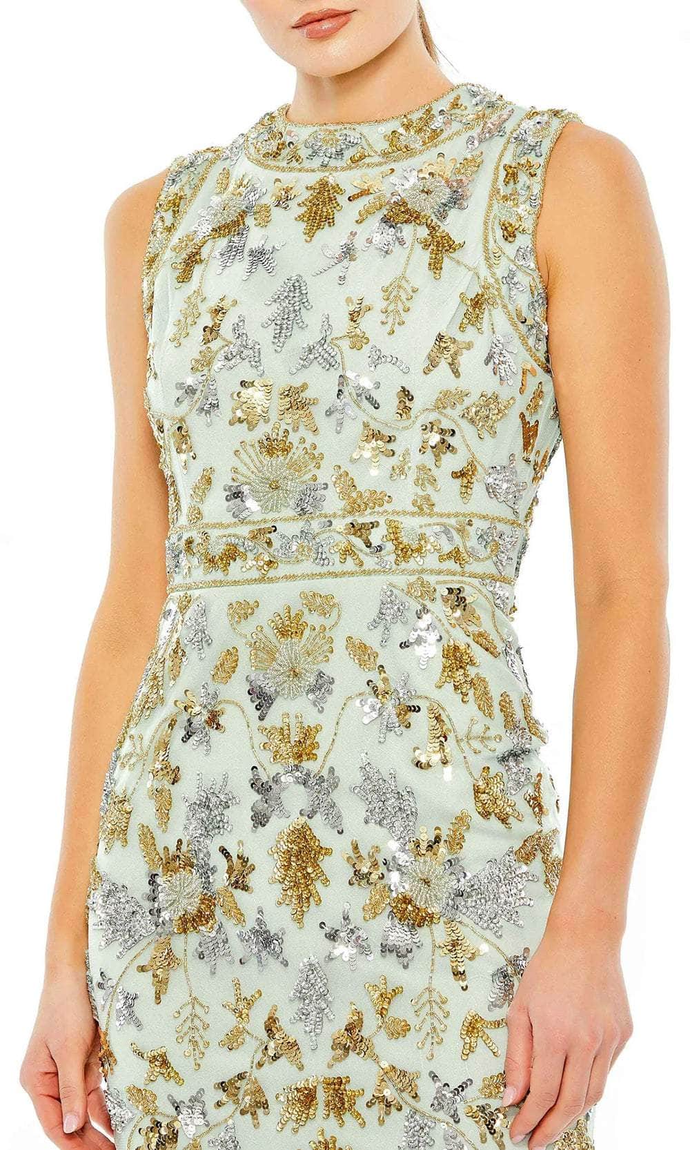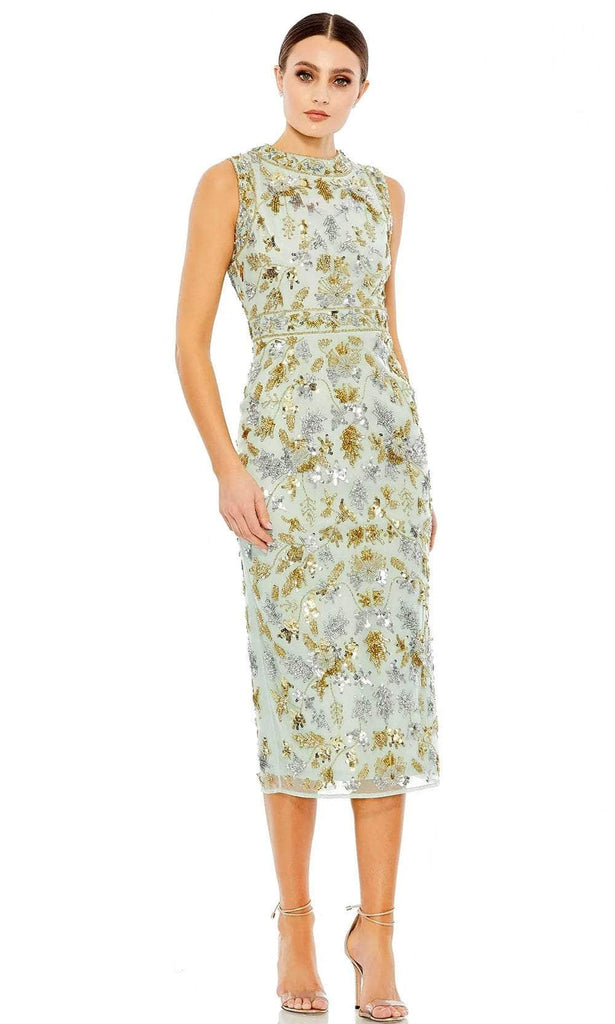Look jaw dropping in this modest yet trendy dress by Mac Duggal 93761. Meticulously tailored on a mesh fabric, this dress flaunts intricate hand embellishments all throughout in a lovely floral pattern. High neckline and back for modesty; sleeve and waistband edgings also provide a decorative touch. The back zipper closure secures a perfect fit while the back slit of the tea-length sheath skirt ensures your ease of movement. Every detail of this dress by Mac Duggal is dripping with faultless charm! Model is wearing the Sage color.