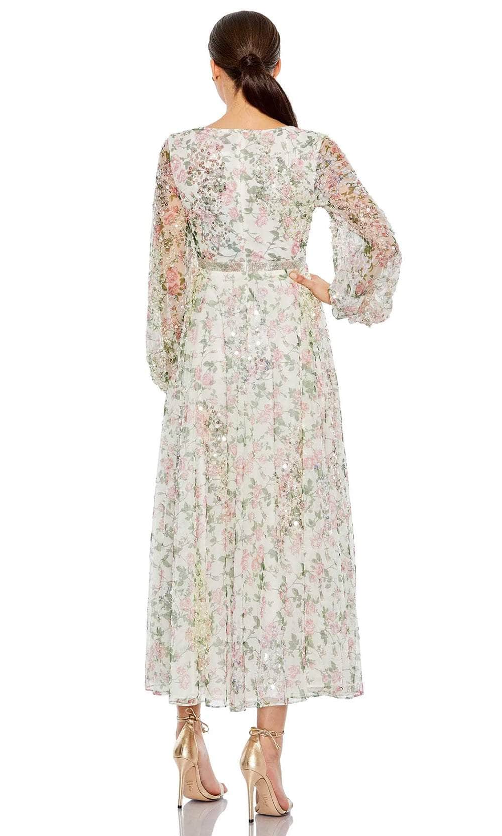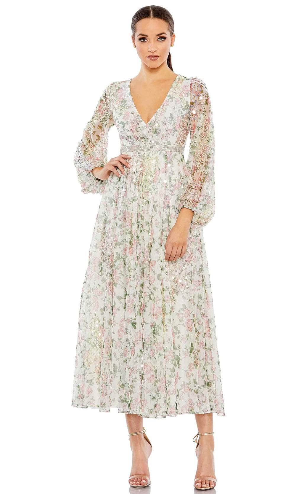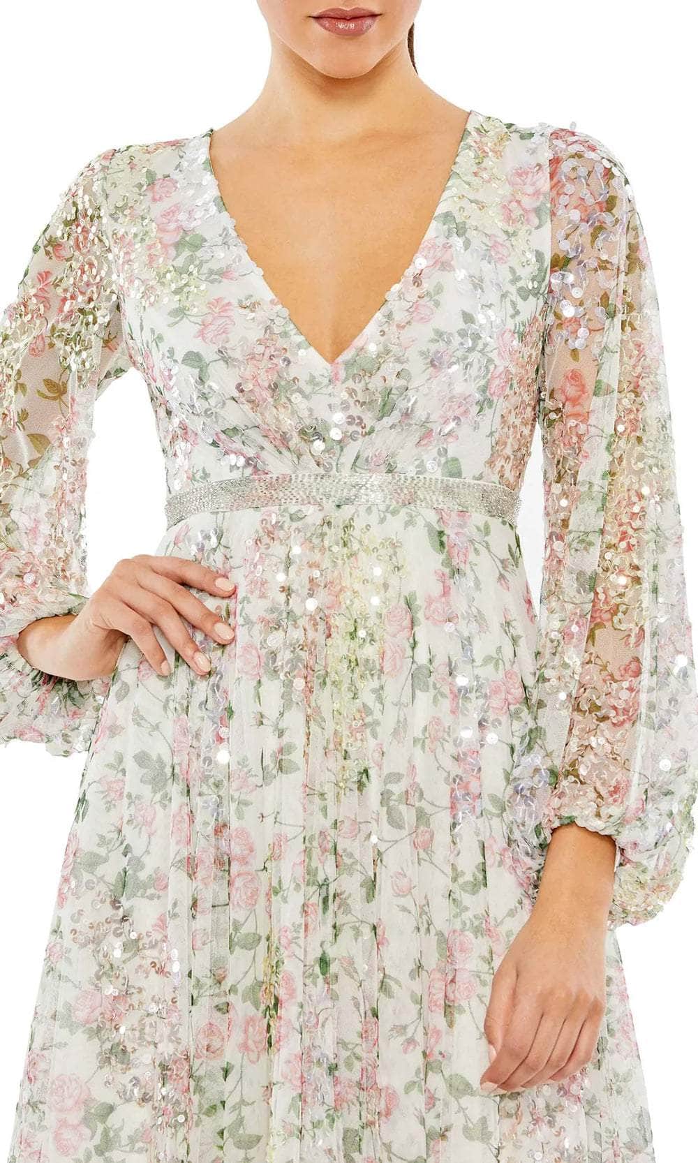 Impress everyone with the spectacular beauty of this Mac Duggal 93788 creation. This dress's full lining and mesh overlay create a breezy, comfortable effect, in addition to its vibrant floral motif. Displaying a classic V-neckline and full-back, with long, unlined bell sleeves which will magically give you a refined appeal. The A-line style of the skirt draws attention to your beaded waistband and creates a flattering hourglass shape. A perfect creation for the Bride or Groom's mother, this Mac Duggal creation is sure to draw everyone's attention. Model is wearing the White Multi color.