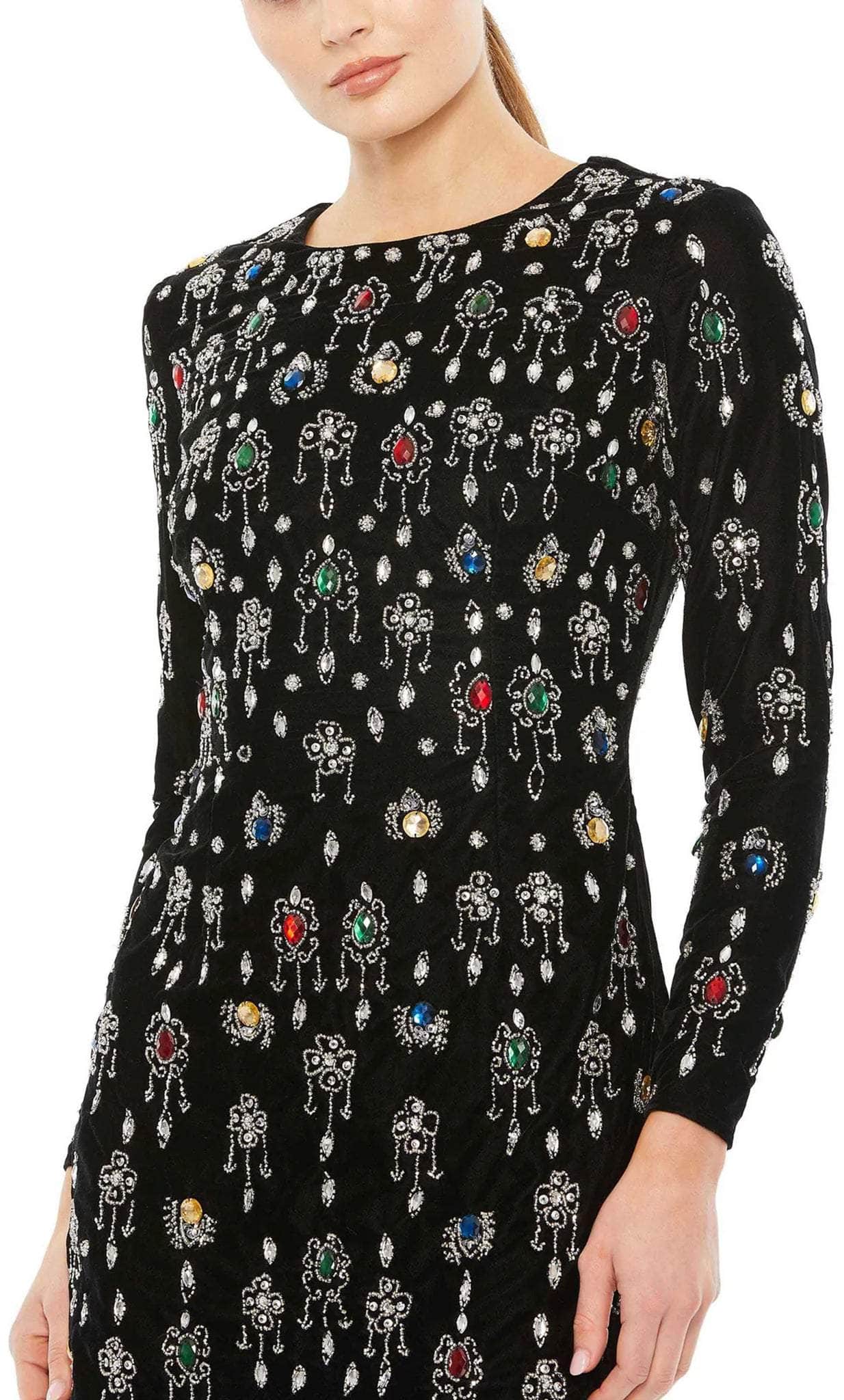 Spice up your special date with a dash of heat in this sultry piece by Mac Duggal 93811. A short dress in sheath silhouette that uses long sleeve design and jewel neckline. The whole piece is embellished with a variety of gemstones. Back is concealed using a zipper to fasten and secure the dress. Wear this piece for semi-formal, cocktail events! Embrace a style that is immaculately sultry as you glam up for your event in this Mac Duggal 93811 creation. Model is wearing Black color.