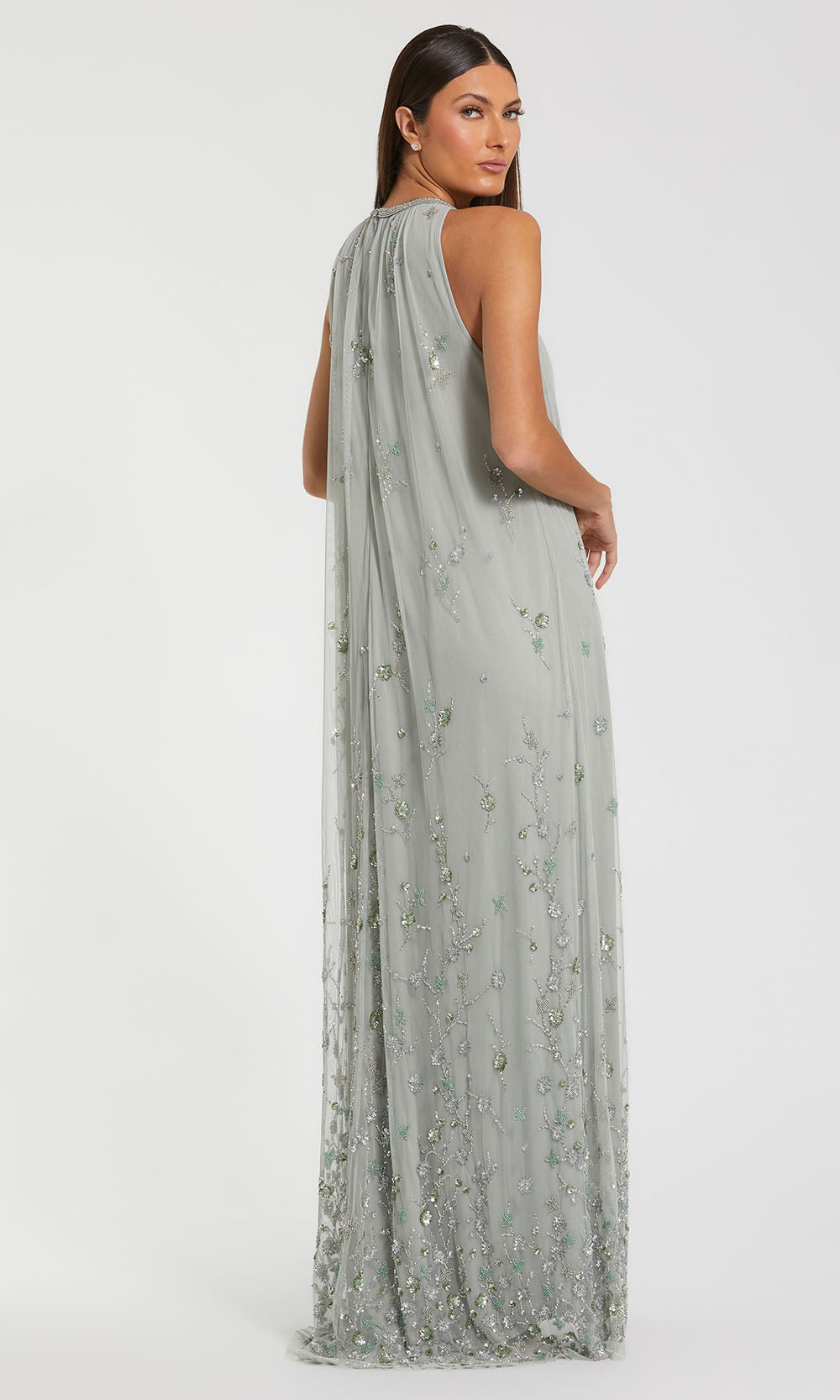 Mac Duggal 9382 embodies minimalist beauty, subtly enhanced with exquisite touches perfect for those drawn to quiet sophistication. The jewel neckline flows into a relaxed A-line silhouette, while the mesh overlay features delicate floral pattern of light-catching beads. Its high-low hemline adds a whisper of movement, contributing to a soft yet structured profile. The gown radiates poise with a design that drapes beautifully over the frame without sacrificing shape. For an event that calls for delicate refinement, Mac Duggal 9382 provides effortless beauty and timeless charm. Model is wearing Sage color.