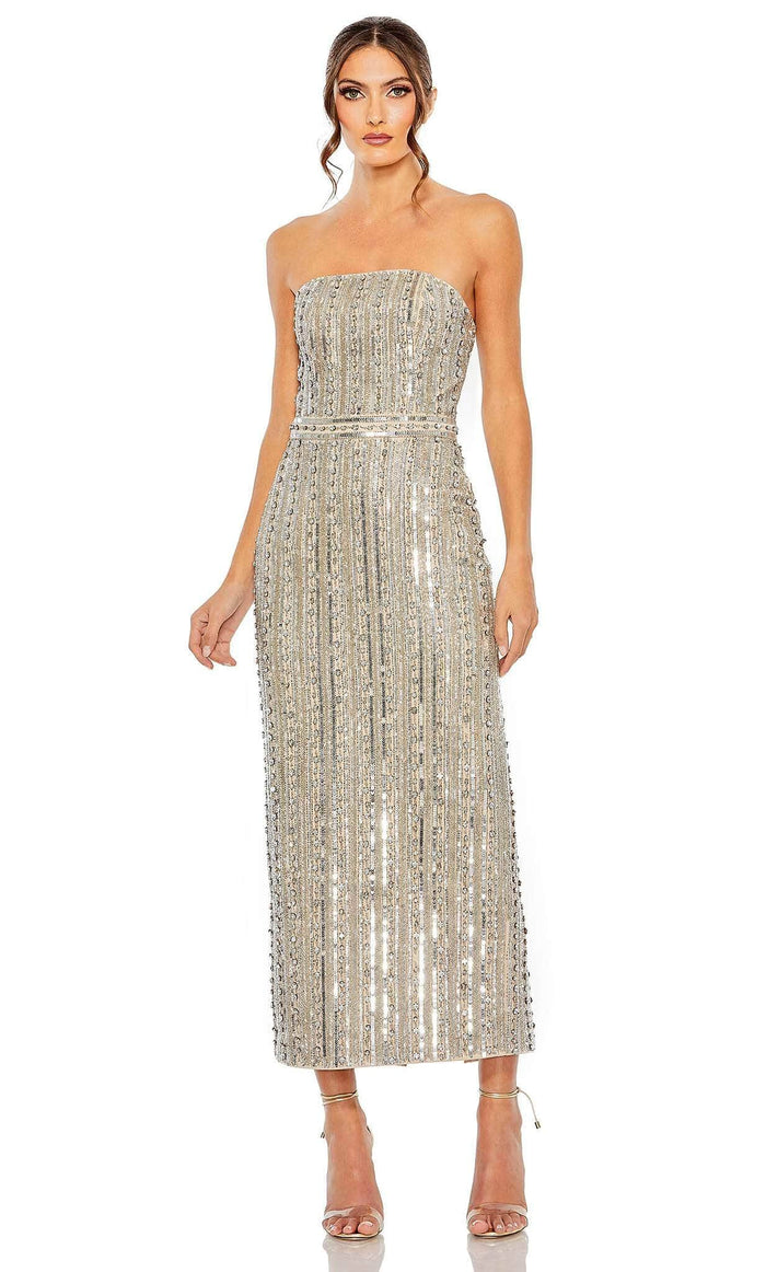 Get ready for everyone to stop and stare when you show up in this Mac Duggal 93831. This dress is a true masterpiece, embellished from top to bottom in dazzling rhinestones and sequins that exude a sense of refined elegance. The bodice boasts a sophisticated straight across neckline and is seamlessly crafted with a concealed zipper at the back for an understated yet sophisticated finish. The waistline is adorned with ornate embellishments that elevate the overall aesthetic of the dress. The tea-length skirt presents a chic and modern take on the classic column silhouette. Experience the outstanding effect of Mac Duggal 93831! Model is wearing Nude color.
