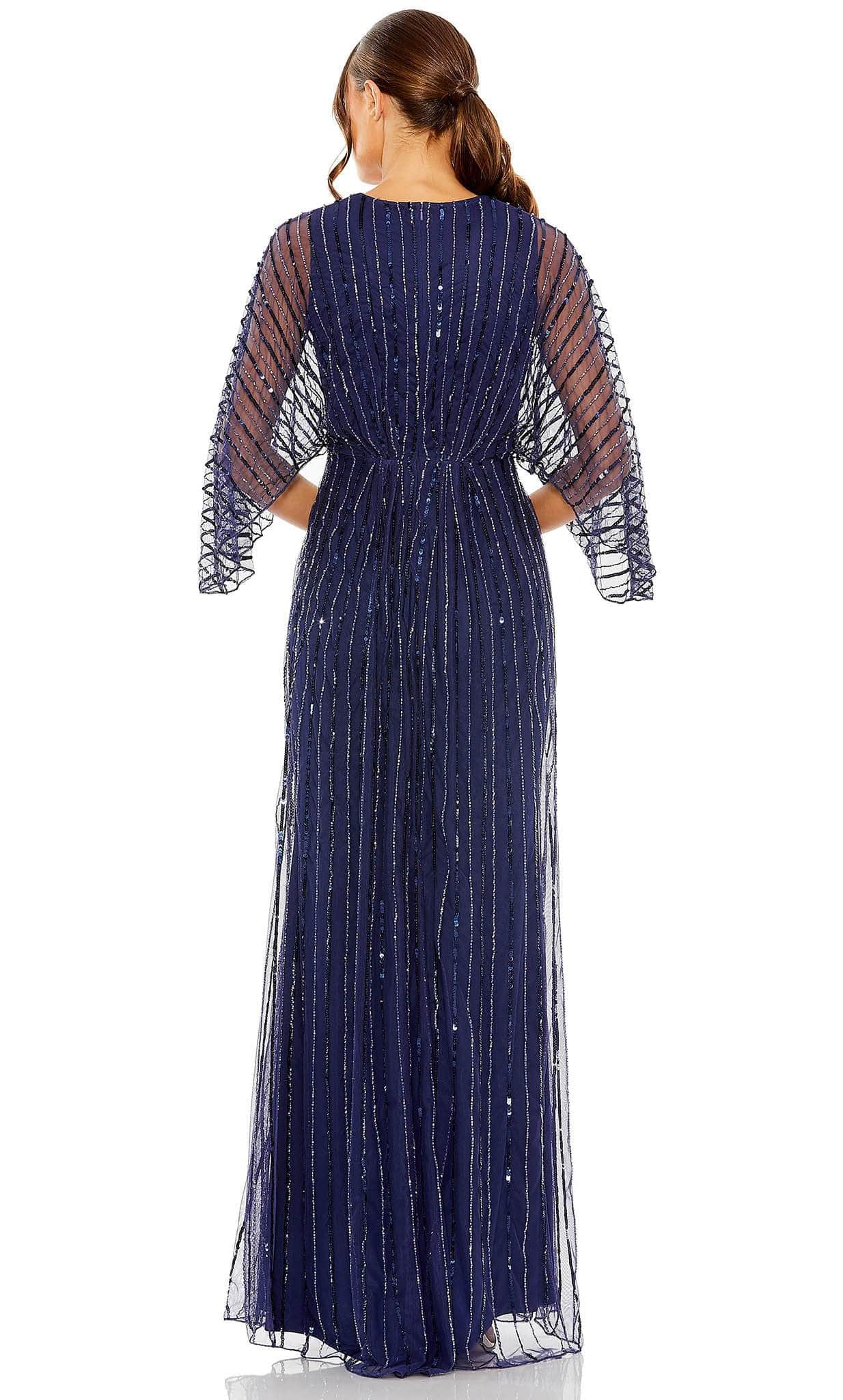 Surround yourself with a sparkle of glamour when you walk in this Mac Duggal 93841 creation. Stunning from top to bottom, this style is festooned with sparkly beadings and sequins in a linear pattern. The gown features a v-neckline, and kimono quarter sleeves, while the back is fully covered close by a center zipper. A full length skirt graces in an A-line silhouette. Fascinate the crowd wearing this exceptional Mac Duggal 93841 masterpiece. Model is wearing the Navy color.