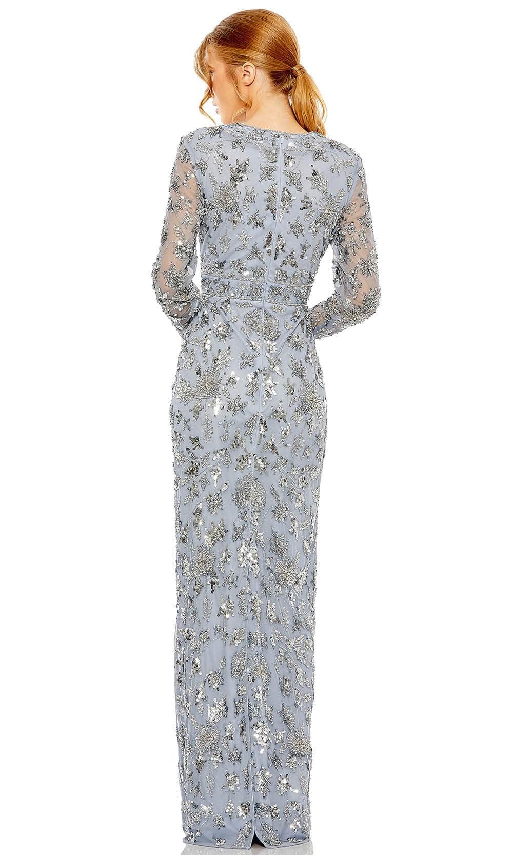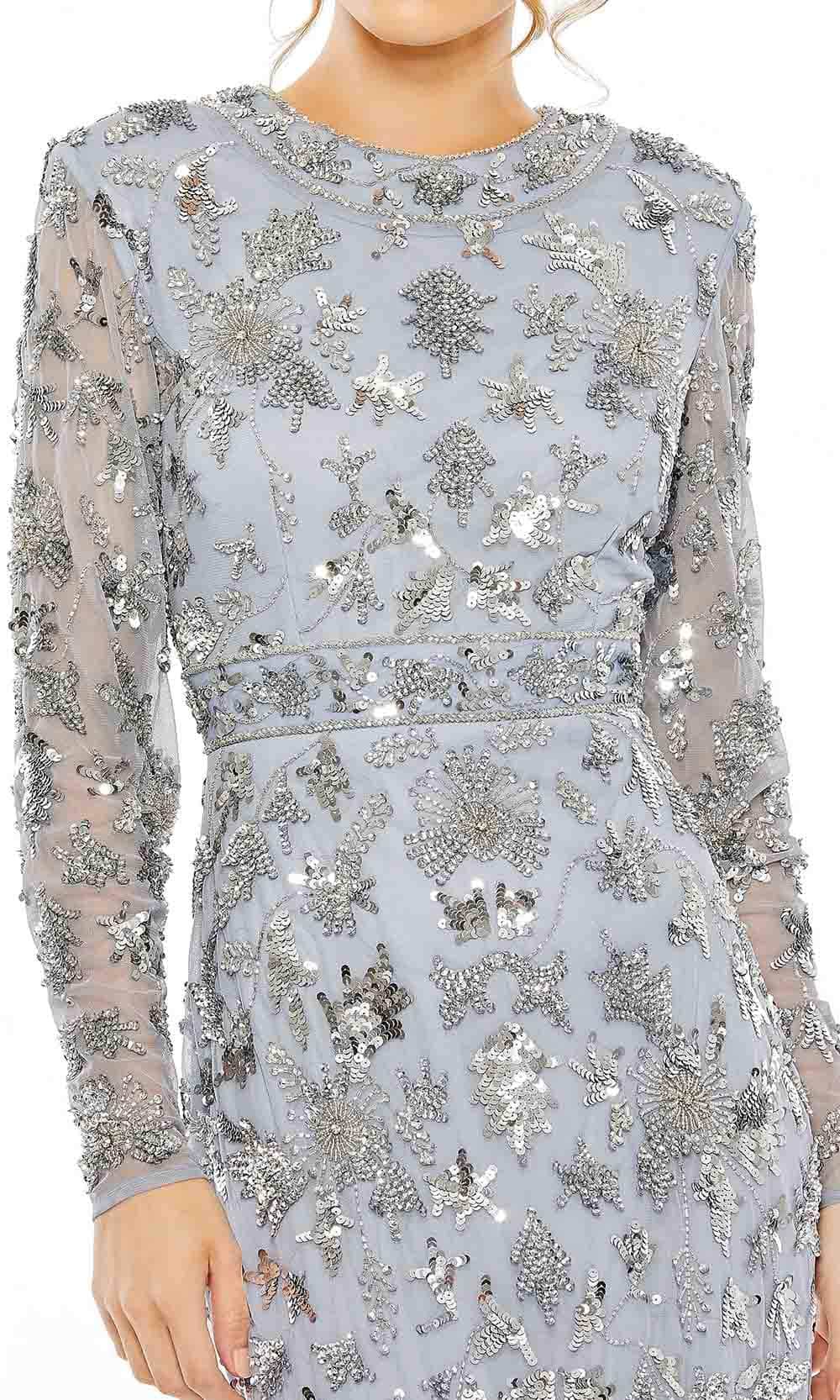 Experience the epitome of glamour with the Mac Duggal 93939 dress. This enchanting gown showcases an illusion high neckline that exudes sophistication. The long sheer beaded sleeves add a touch of grace. Adorned with an intricate and delicate sequined and beaded pattern, this dress shimmers and sparkles from every angle. The hand-beaded waist detail accentuates your silhouette with a touch of luxury. With a back zipper closure, the floor-length skirt gracefully parades in a column silhouette, and a back slit adds a hint of sensuality. This extraordinary Mac Duggal 93939 creation will make a statement. Model is wearing Slate Blue color.