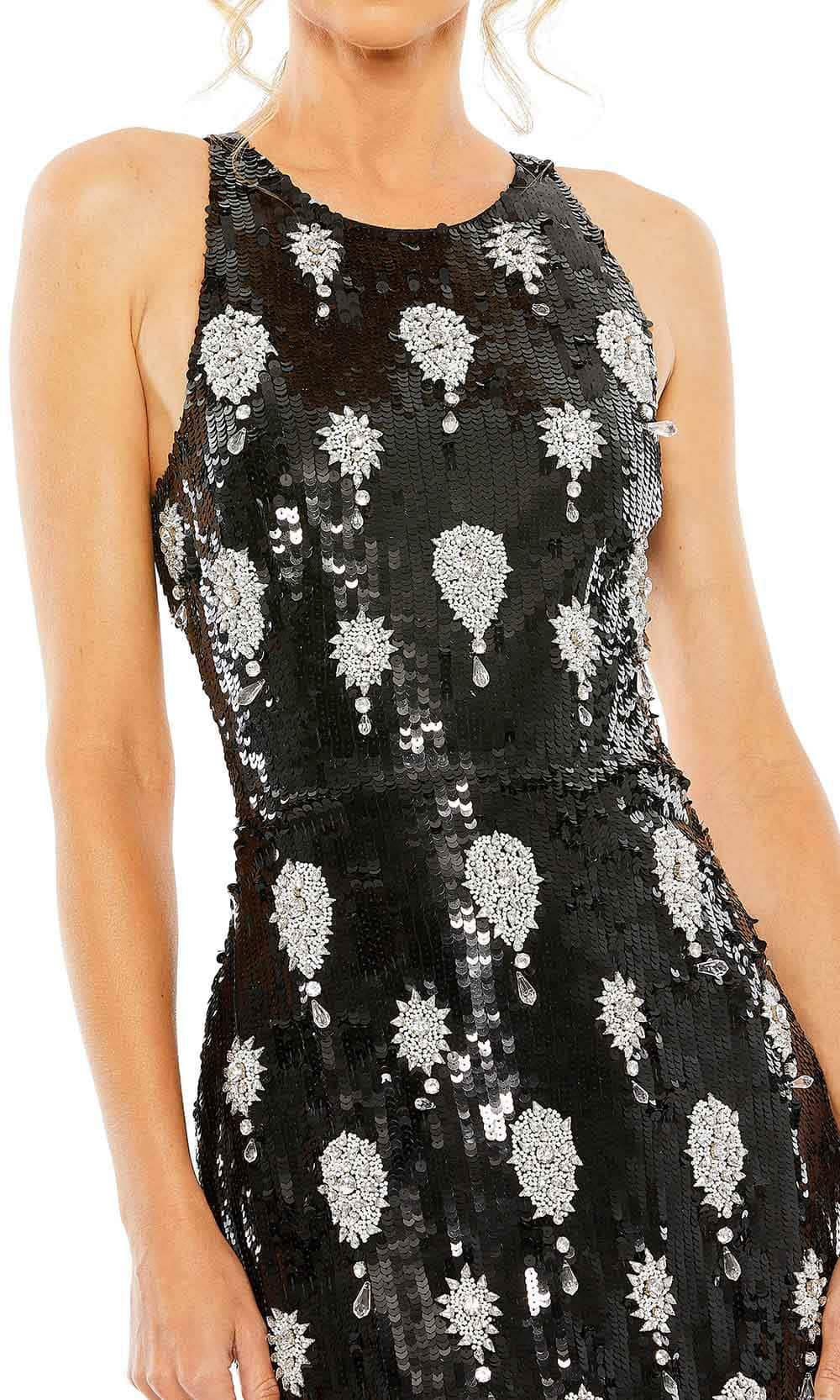 Make a dazzling entrance in wearing Mac Duggal 93944 and turn heads. The crystal drop beads on the sequined garment have been intricately placed that they reflect light from every direction. The side slit are a beautiful finishing touch that elevate the dress along with its radiating details to a whole new level of glitz and beauty. The zipper is concealed in the rear for a smooth and secure wear and the sleeveless cut reveals your lovely shoulders and arms while allowing you to move freely. Mesmerize everyone in this charming Mac Duggal masterpiece! Model is wearing Black.