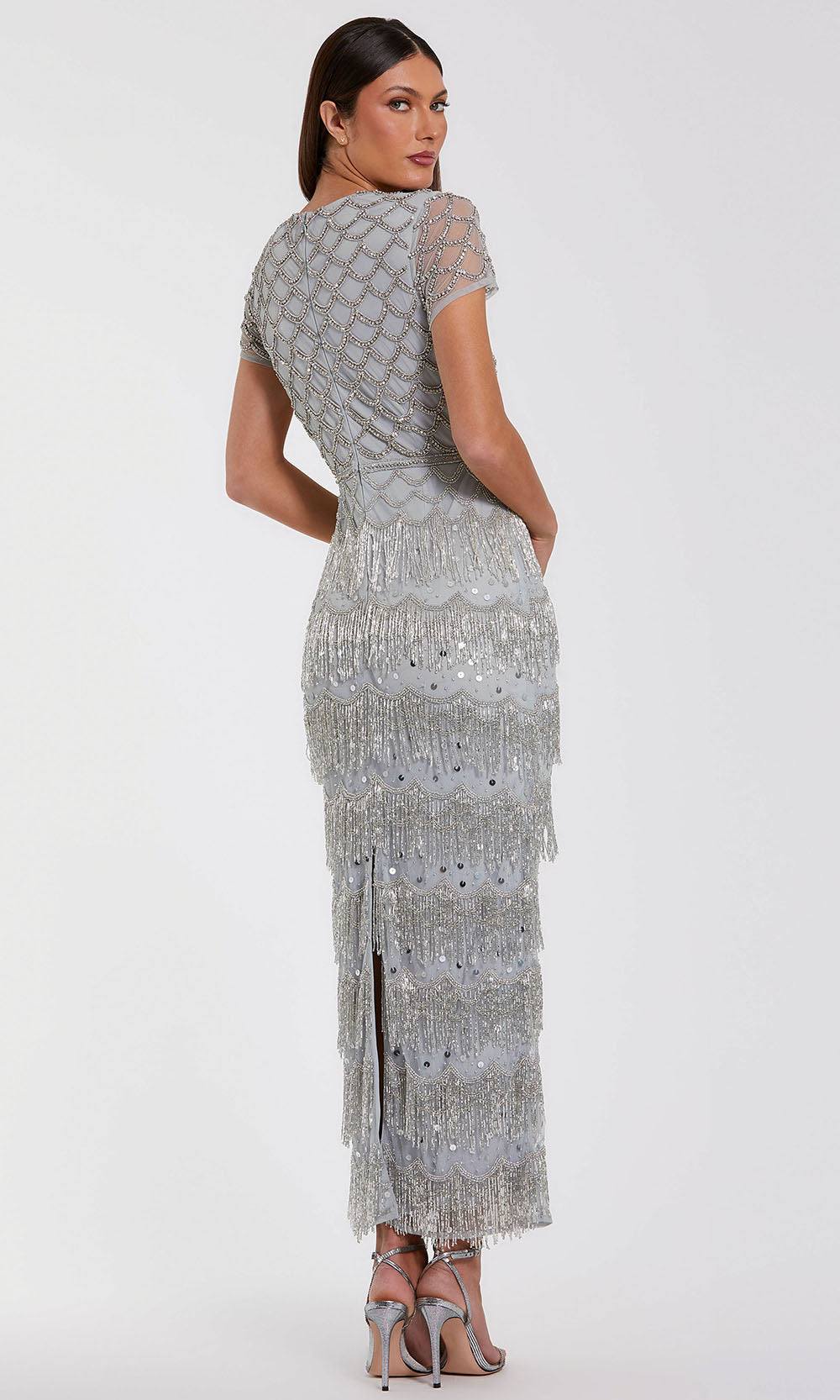 Geometric intricacy and rhythmic detailing elevate this Mac Duggal 94077 beaded gown into a sophisticated statement piece. It features a fitted bodice with a jewel neckline and sheer short sleeves, intricately embellished in a scallop-patterned beadwork. Below the waist, tiered rows of beaded fringe descend in elegant waves, moving beautifully with every step. The sheath silhouette maintains a refined profile while highlighting the textural contrast between top and skirt. Whether you are attending a gala or formal celebration, Mac Duggal 94077 style radiates confident elegance with a fresh perspective on vintage glamour. Model is wearing Seafoam color.