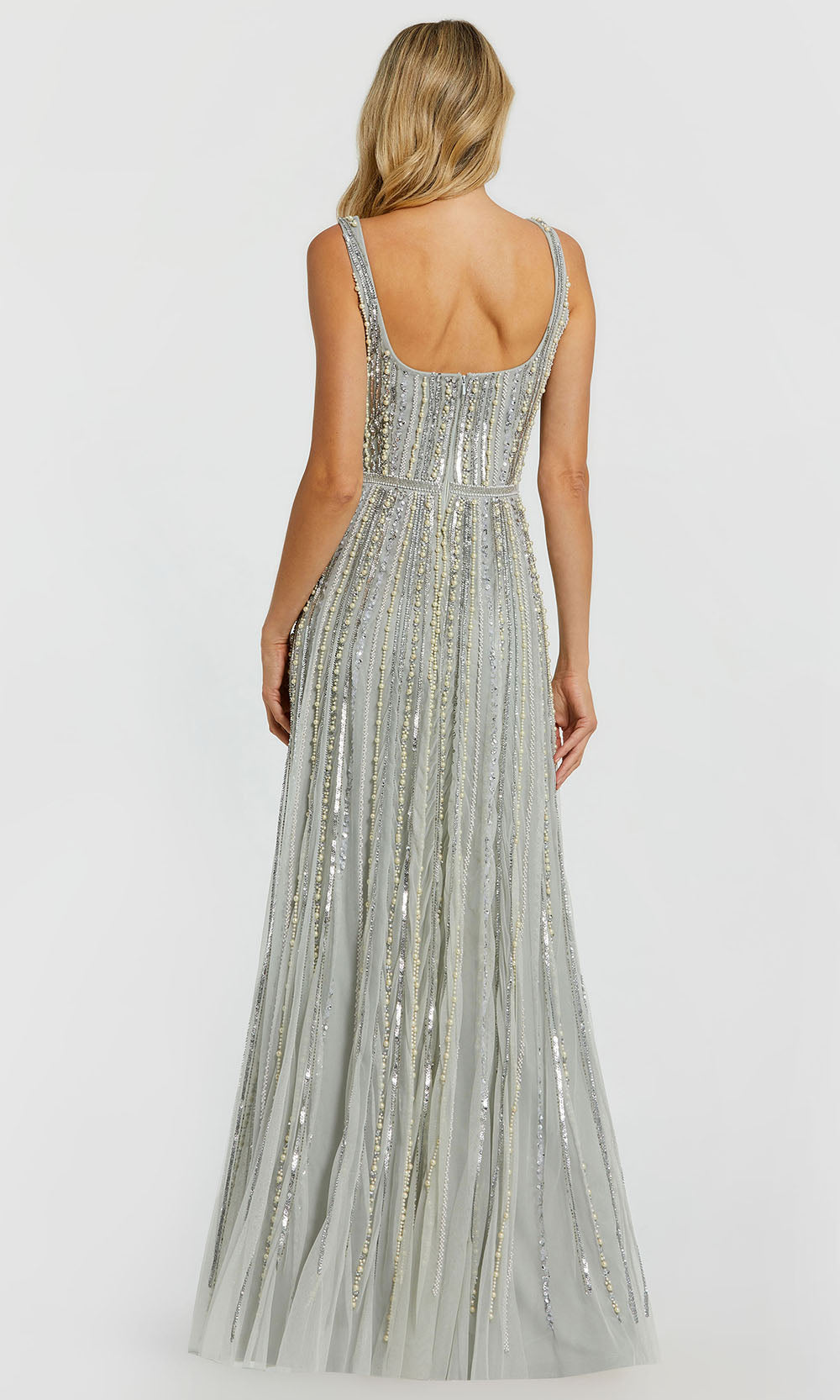 Polished and radiant, this Mac Duggal 94080 full-length gown brings refinement through every detail. It flaunts a square neckline and sleeveless bodice, both structured to frame the shoulders and collarbone elegantly. Striped beading embellishments run down the gown in uninterrupted lines, accentuating the figure while adding dimension and shine. The floor-length A-line skirt flows gracefully, delivering soft movement that complements the gown luminous profile. For black-tie occasions or formal events, Mac Duggal 94080 style is a striking choice that feels timeless yet distinctively modern. Model is wearing Powder Blue color.