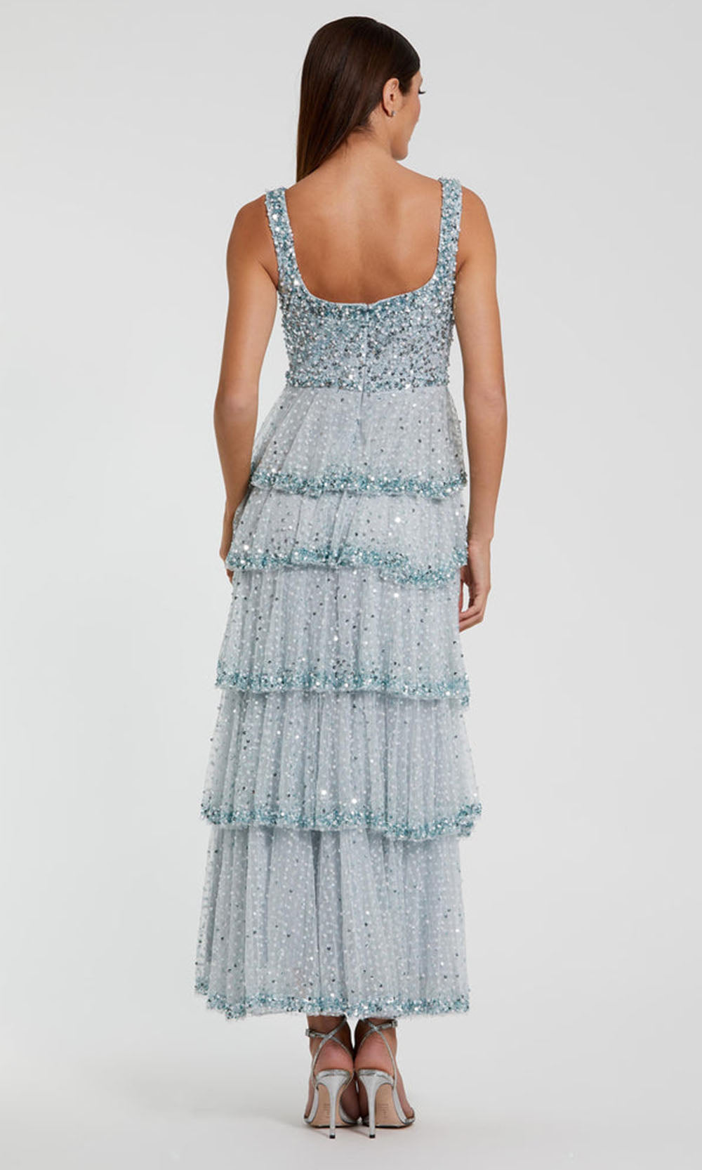 | Details: | Sequin Embellished Bodice, Ruffle Tiered Skirt, Wide Straps, Open Back |