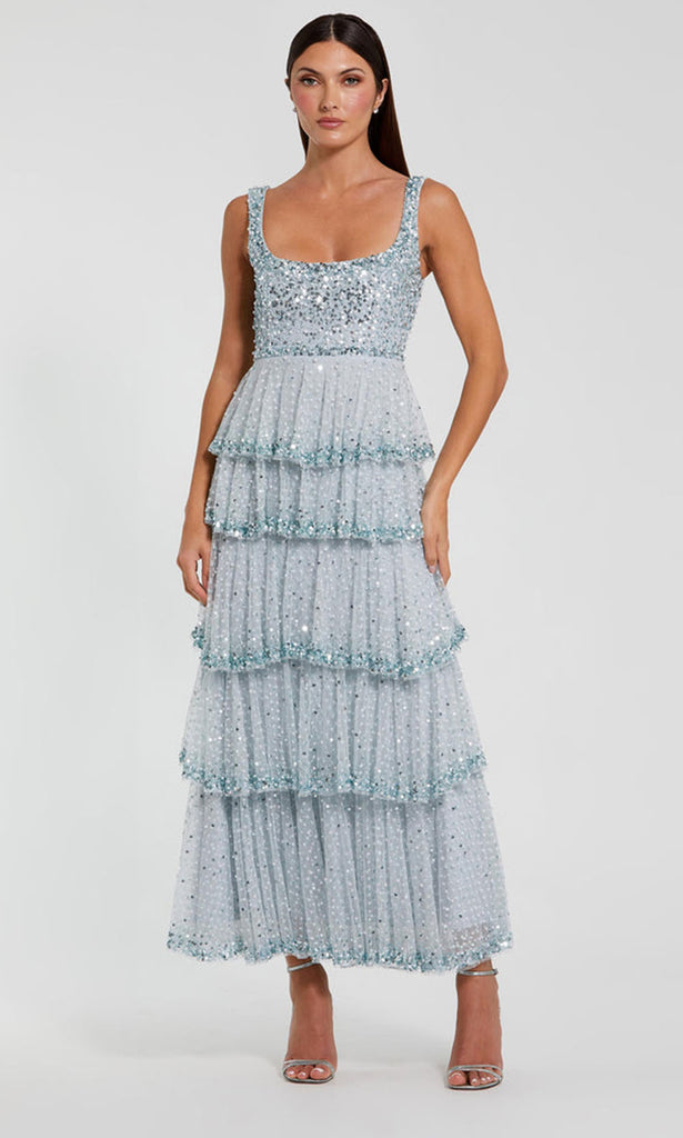 Soft glamour takes center stage in the Mac Duggal 94165, a sleeveless dress full of textural intrigue and elegant shimmer. This ensemble showcases a fit and flare bodice embellished with reflective sequins, cascading into a tiered A-line skirt for a radiant finish. Wide straps frame the scoop neckline with support and style, while each layer of the skirt sparkles with sequined edging. Perfect for cocktail evenings, receptions, or upscale celebrations, the Mac Duggal 94165 offers timeless refinement with a fresh, festive spirit. Model is wearing Powder Blue color.