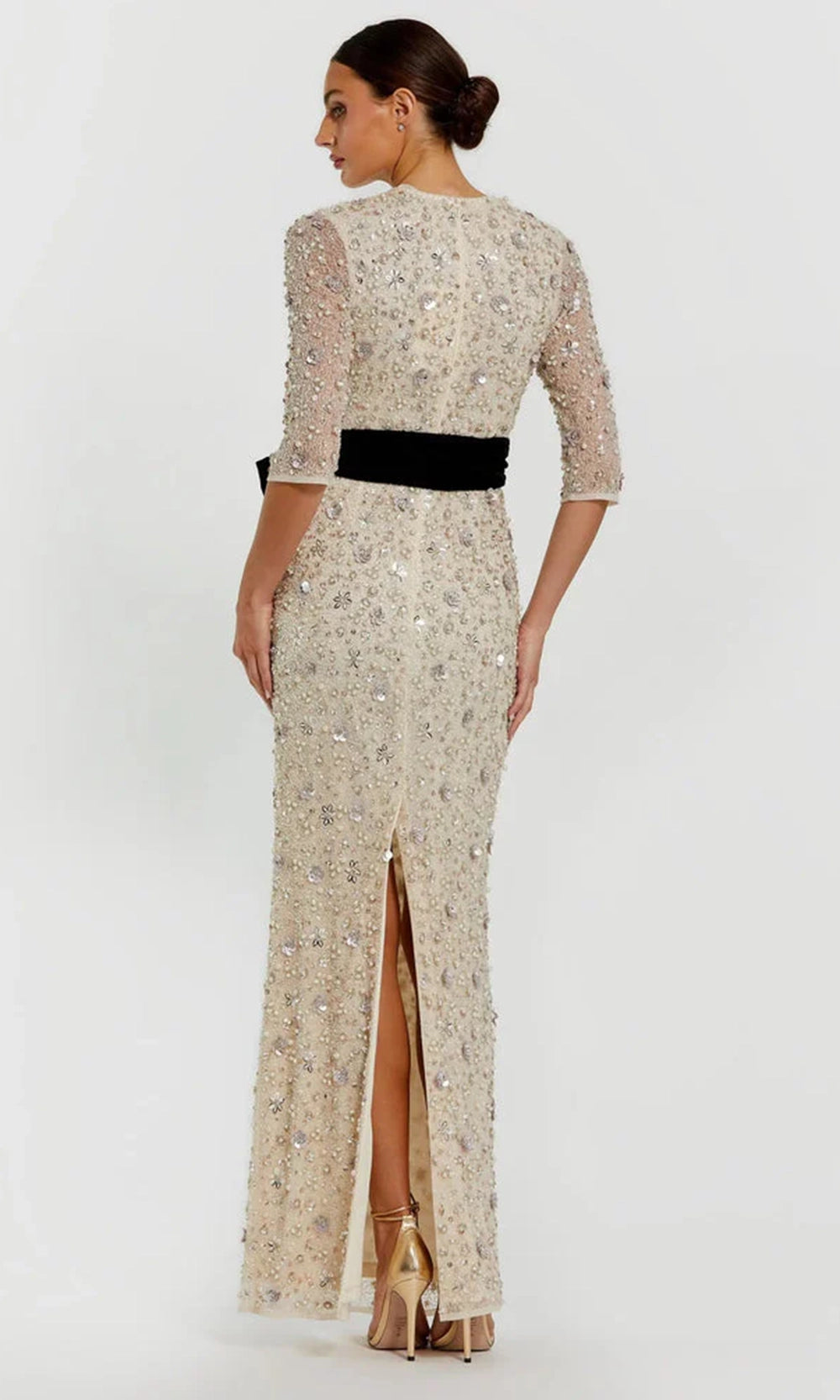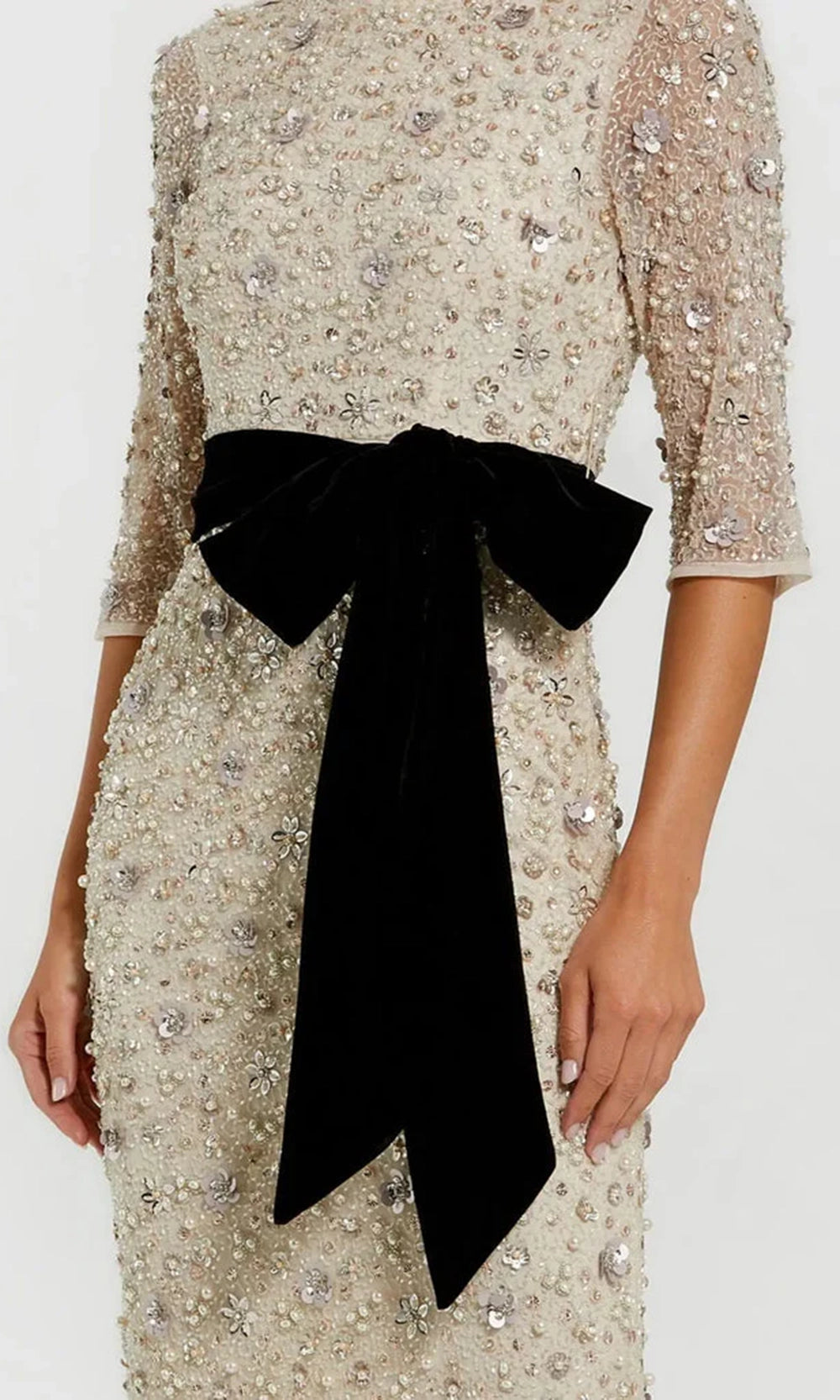 | Details: | Sheer Three-Quarter Sleeves, Velvet Bow Belt, Back Slit, Concealed Back Zipper, Pearl and Seed Beadwork, All-Over Sequin |