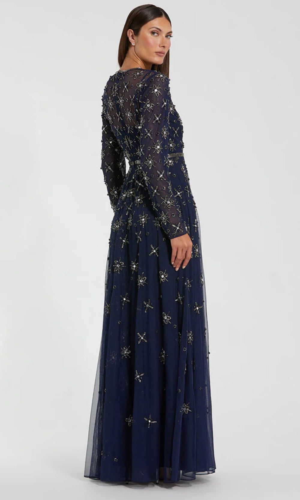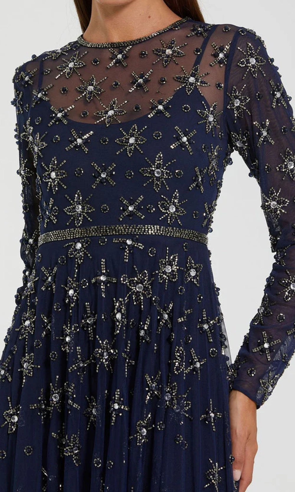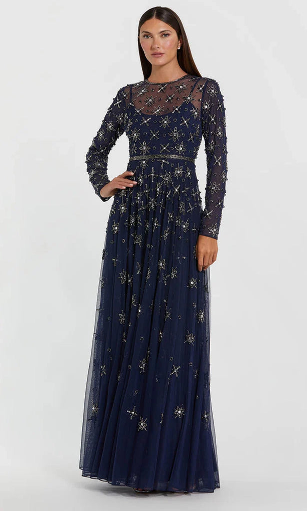 There is a magic in gowns that sparkle like the night sky, and this Mac Duggal 94216 A-line style embodies that celestial inspiration. Beaded embellishments are scattered like constellations, creating a luminous display across the sheer overlay. The illusion jewel neckline adds refinement to the fitted bodice, while long sheer sleeves give an elegant, balanced finish. A defined thin waistband ensures the silhouette remains flattering, offering poise with every movement. The Mac Duggal 94216 captures elegance and wonder, a gown designed for occasions where radiance and sophistication are a must. Model is wearing Midnight color.