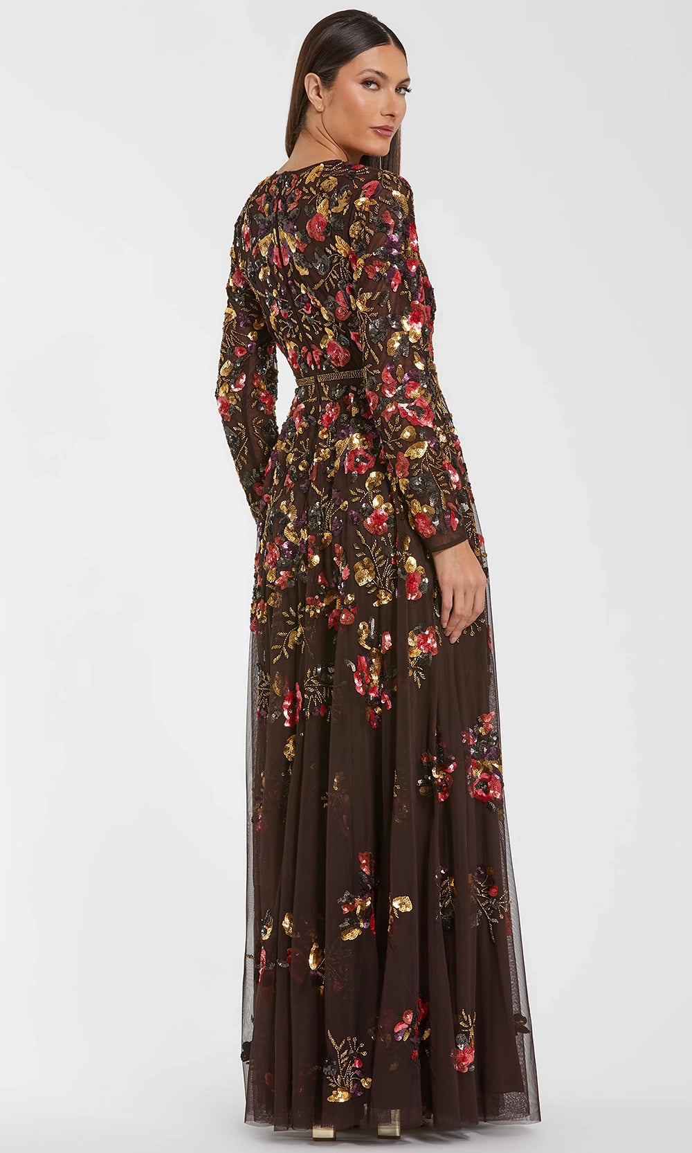 Mac Duggal 94275 channels a whimsical mood with its abundance of richly detailed floral embroidery. The structured bodice features illusion accents and jewel neckline that bring a modern edge, while the A-line skirt offers soft volume and graceful movement. Each vibrant floral sequin and beadwork are thoughtfully placed to highlight the contours of the silhouette and create visual intrigue. Long sleeves complete the look with balance and sophistication. Mac Duggal 94275 is a distinctive style crafted to reflect a keen eye for statement details and timeless beauty. Model is wearing Espresso Multi color.