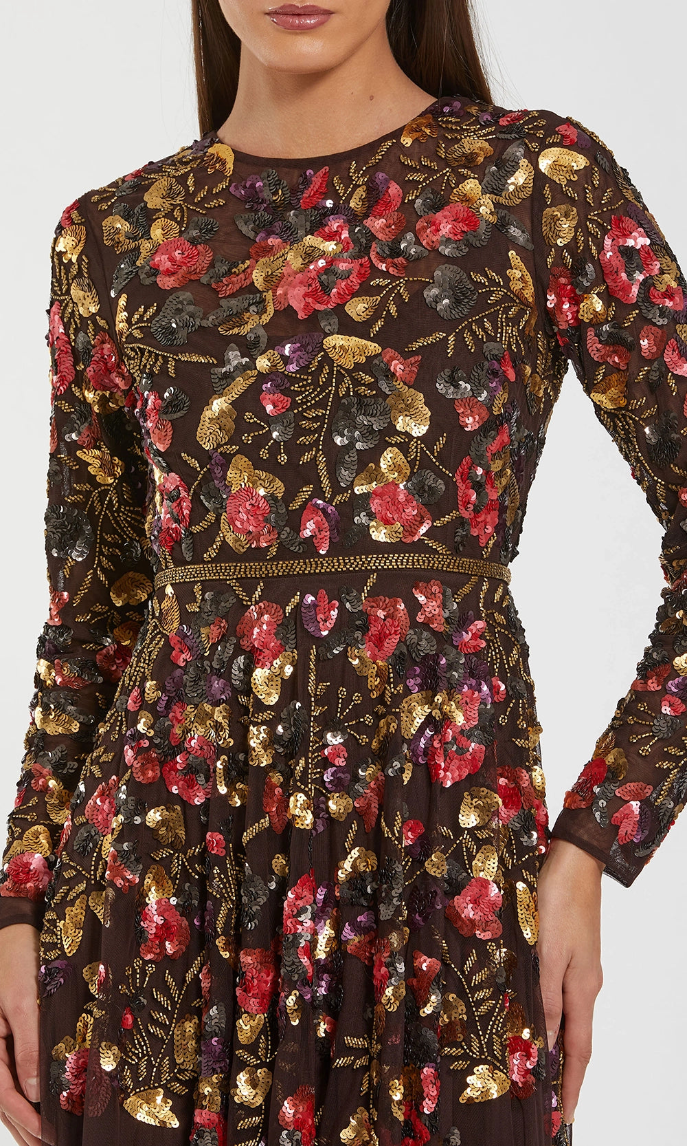 | Details: | All-Over Floral Sequin and Beading, Long Sleeves, Thin Waistband, Full Back, Concealed Back Zipper |