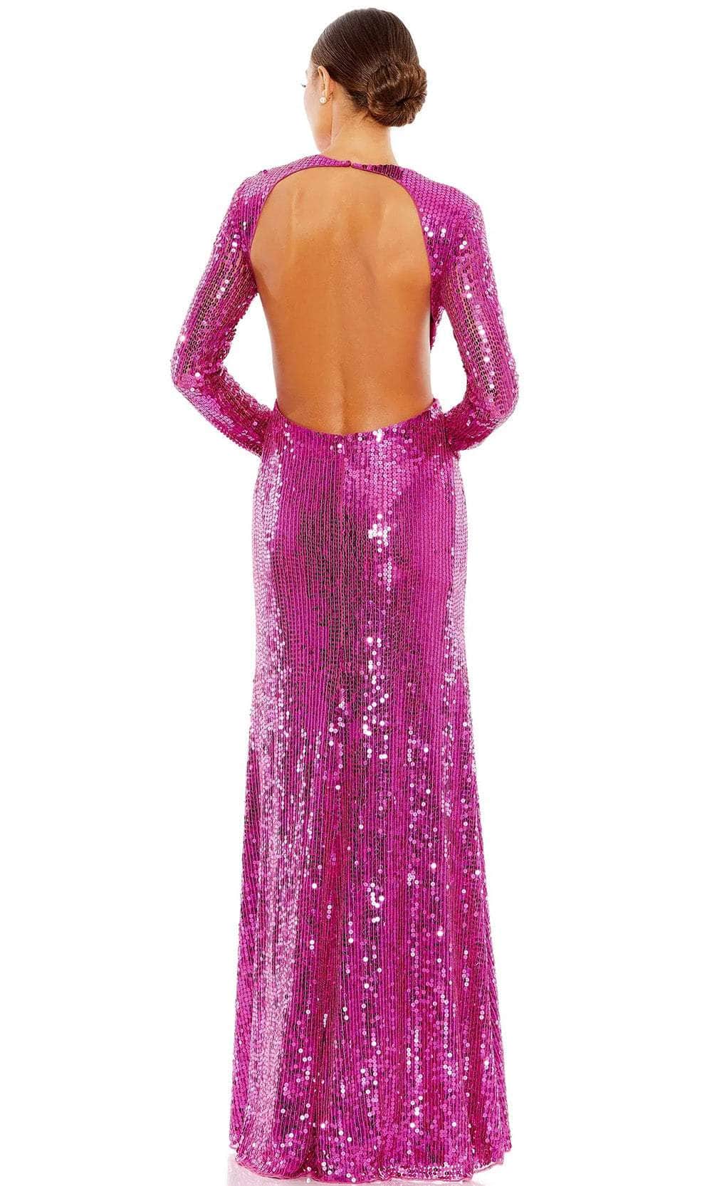 Indulge in pure glamour in this Mac Duggal A10891 masterpiece. Encrusted with iridescent sequins, this statuesque dress glistens from every angle and steals the spotlight. The jewel neckline and long sleeves add a touch of refined sophistication. With its large cutout details at the back and concealed zipper closure, this dress reveals a peek of skin and an enticing appearance. The skirt beautifully carves a sheath silhouette that cascades to the floor length hemline. This Mac Duggal A10891 is the perfect wear to light up the room. Model is wearing Fuchsia color.