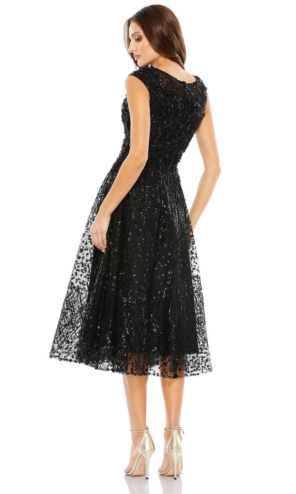 Step into the limelight with our tantalizingly detailed Mac Duggal A20398 masterpiece. This tea-length gown flatters your form with a tailored lining. The bateau neckline adds a touch of sophisticated structure, while the fitted bodice with cap sleeves offers a touch of understated glamour. The fully enclosed back ensures a flawless drape, while delicate embroidery and hand-stitched sequins add a touch of shimmering intrigue. The A-line skirt gracefully flows into a tea-length hem, creating a silhouette that is both elegant and contemporary. Embrace the night with royal elegance wearing this Mac Duggal A20398 creation. Model is wearing the Black color.