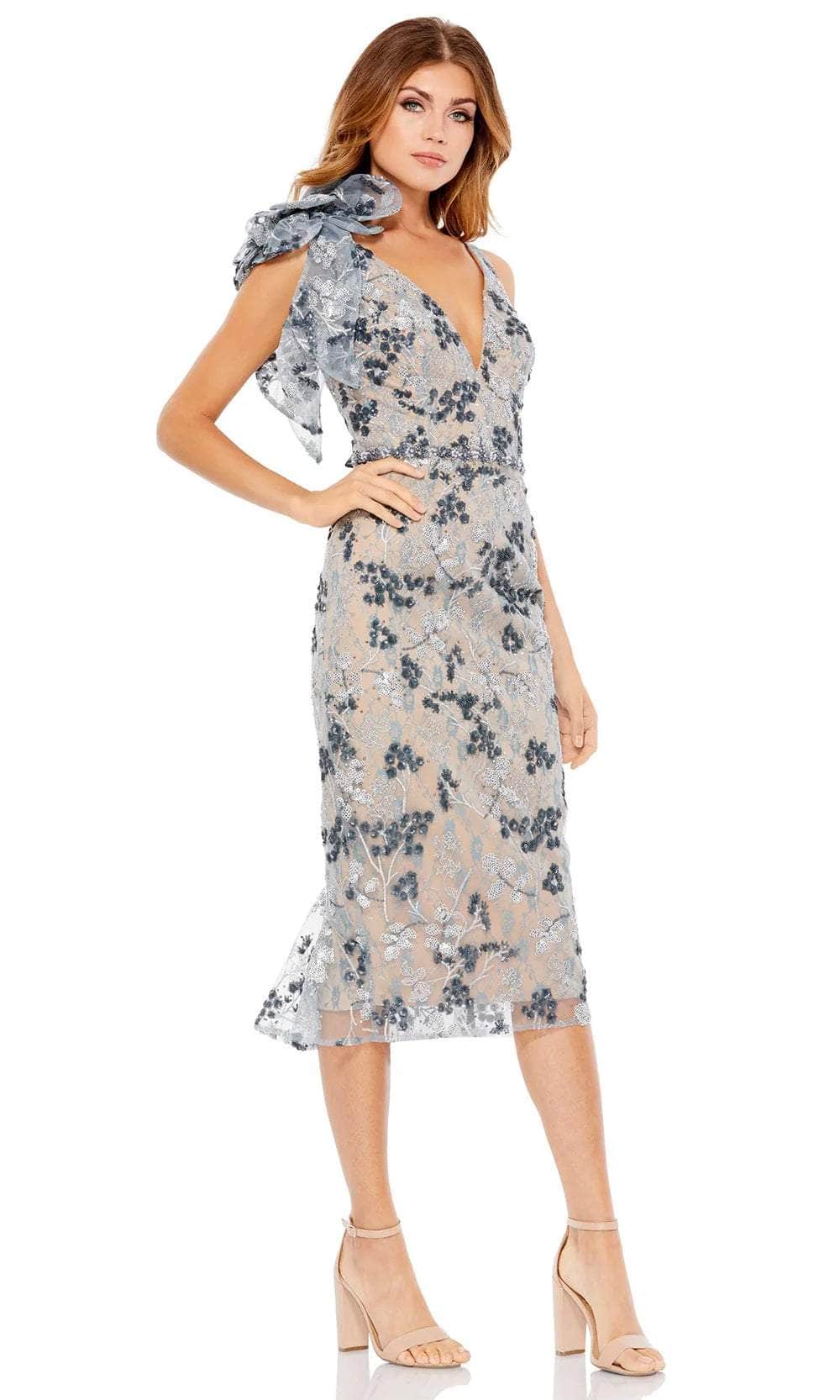 Blossom into a vision of captivating elegance with the Mac Duggal A79337 masterpiece. This tea-length dress transforms you into a vision of springtime enchantment. The mesh overlay, meticulously adorned with shimmering sequins, beads, and crystals, catches the light with every movement. The V-neckline flatters your décolletage, while the dramatic rosette adorning the shoulder adds a touch of whimsical grandeur. The hand-beaded belt cinches your figure, creating a beautifully defined silhouette. The midi-length skirt with a center back slit ensures a touch of contemporary flair. Make a statement with our bold and sophisticated Mac Duggal A79337 creation. Model is wearing the Slate Grey color.