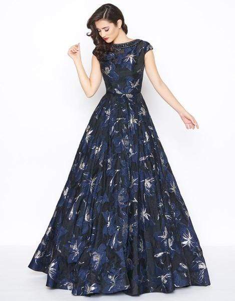 This printed gown stands out in a bateau neckline with cap sleeves. The fitted bodice is styled with a low scoop back. The ballgown skirt flourishes from the natural waist and completes the look with a sweep train.