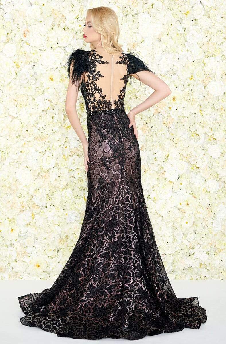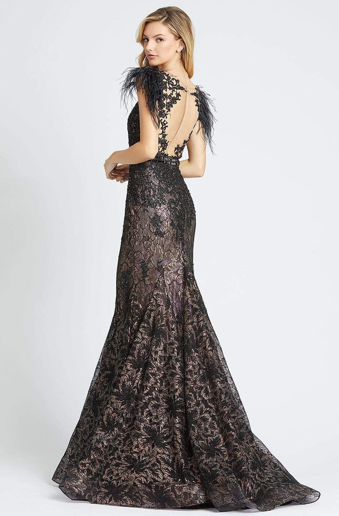 Step out in style wearing this spectacular Mac Duggal Black-White-Red 79230 masterpiece. An illusion bateau neckline crowns the fitted bodice with feathers delicately hand sewn on the outer banks of the cap sleeves. This dress is style in iridescent nude lining with black lace, fused with diamante jet black stones and matching belt. The back offers a sheer full panel with a fabulous sweep train for that perfect finish. Strike a pose as you enter the room in this exquisite Mac Duggal creation.