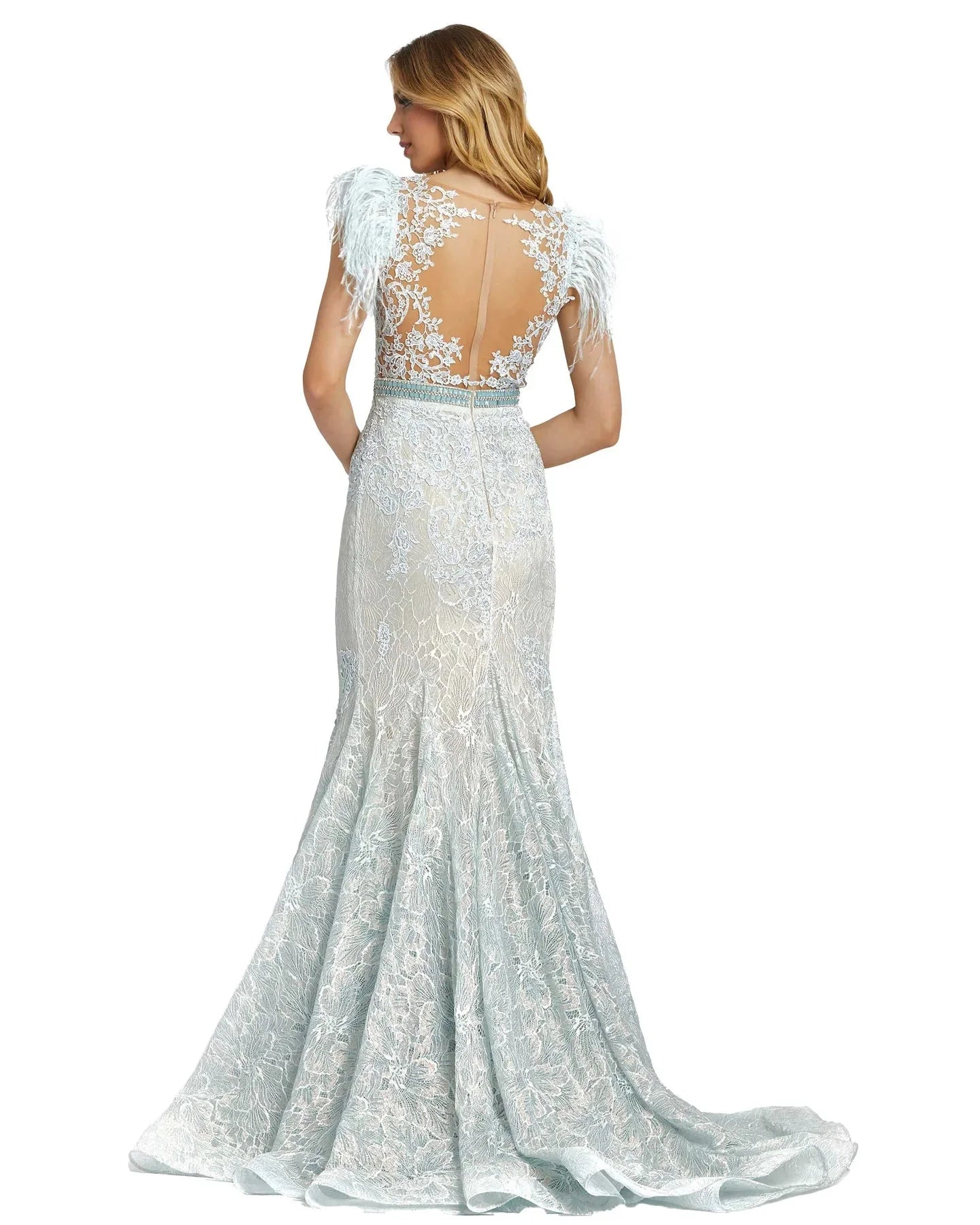 | Details: | Sheer Neckline, Feathered Cap Sleeves, Beaded Waist, Floor Length, Sheer Full Back, Back Zipper Closure, Sweep Train |