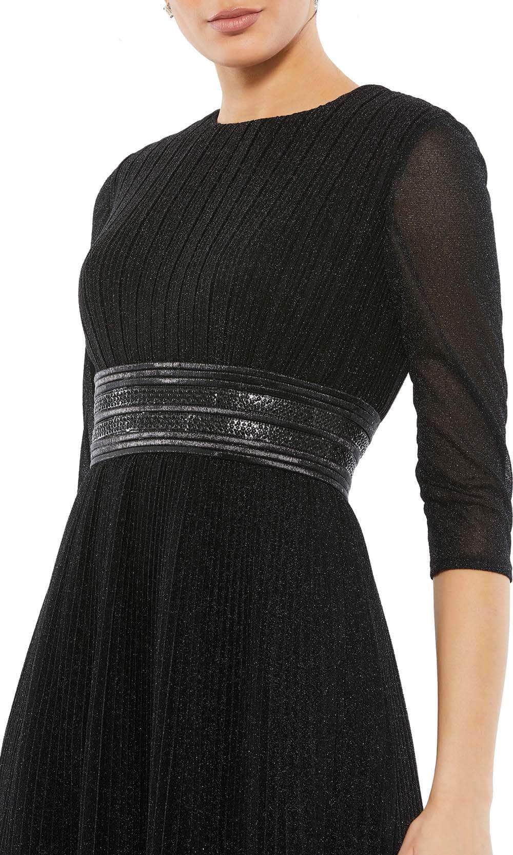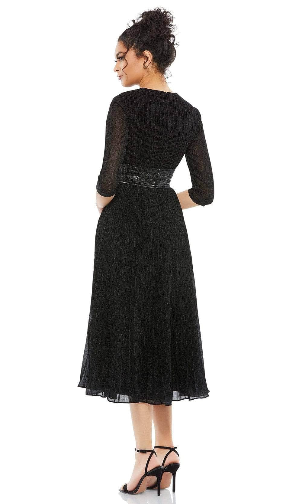 Walk into the room and fascinate everyone with this Mac Duggal 30750 creation. Alluringly rendered with fine pleats, this stunner evokes a jewel neckline with quarter sleeves. Defined at the waist with an embellished band, the shimmering skirt flares into a classy tea length hemline. Don a style that is iridescently charming in this Mac Duggal masterpiece.