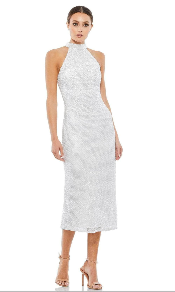 Look simultaneously elegant and sexy in this Mac Duggal 70110 creation. Festooned with lattice rendered beadwork, this sleeveless dress promotes a high halter neckline with a racerback. Skimming the feminine form, the sheath skirt opens with a back slit and streams into a tea length hem. Impress everyone by the class and beauty of this Mac Duggal masterpiece.
