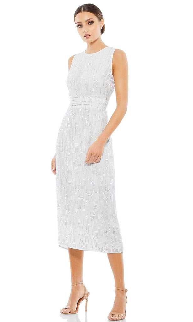 Choose to shine in this classy Mac Duggal 70264 creation. Aggrandized with a cascading geometric motif of sequins and beadwork, this sleeveless dress reveals a jewel neckline and full back. Accented with a back slit, the sheath skirt streams to adhere at a tea length hemline. Lavish in the mesmerizing style of this Mac Duggal masterpiece.