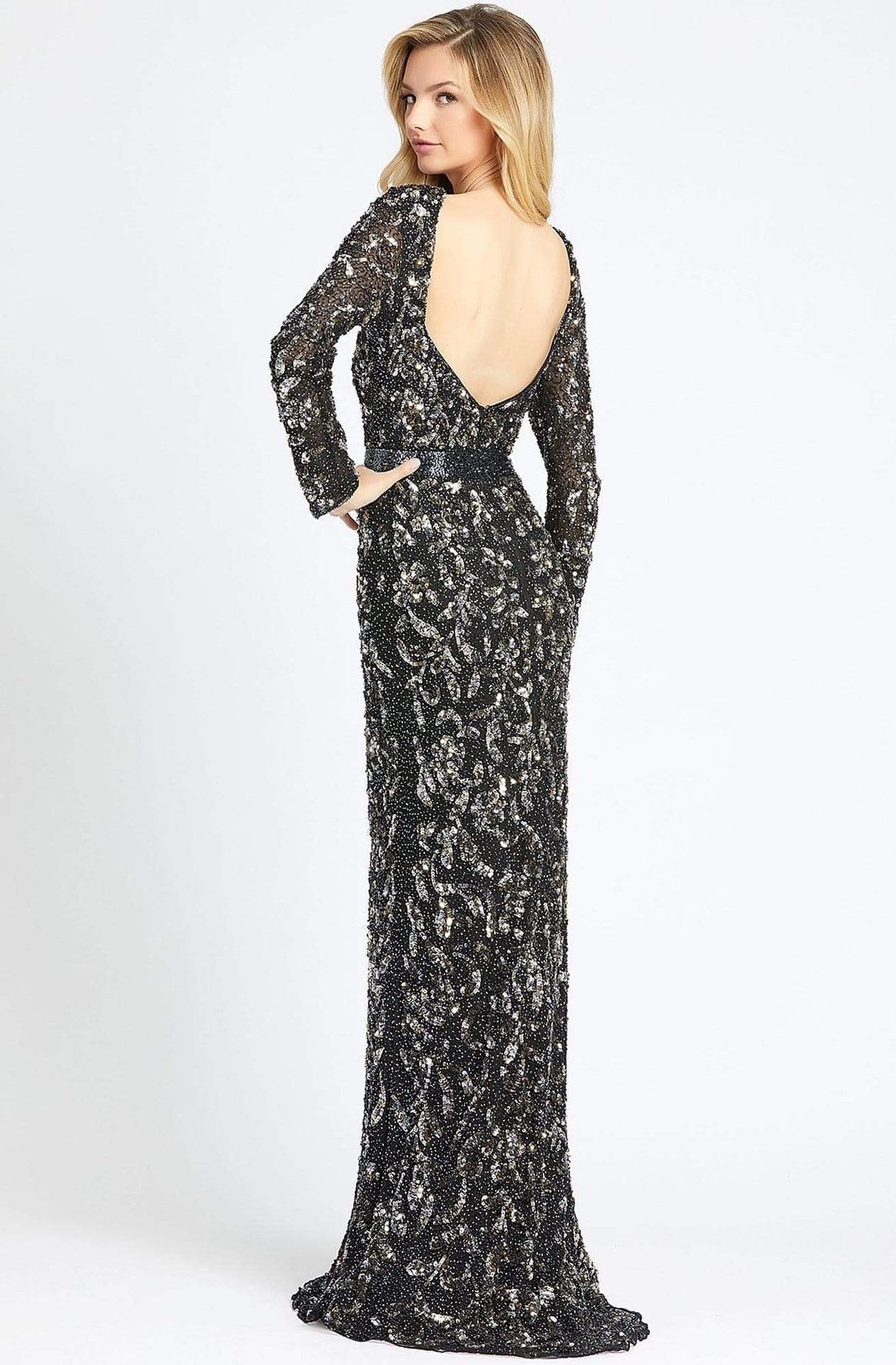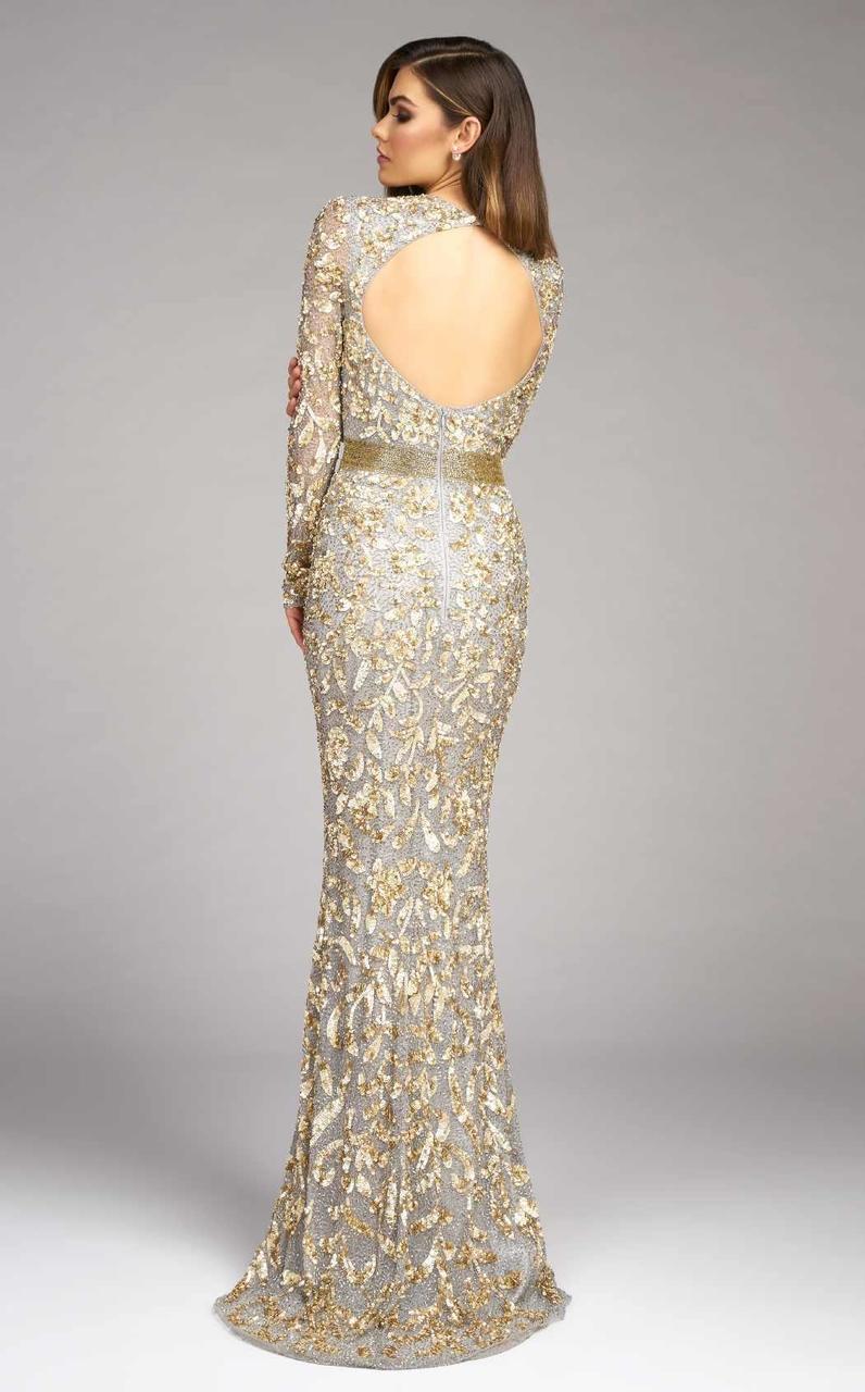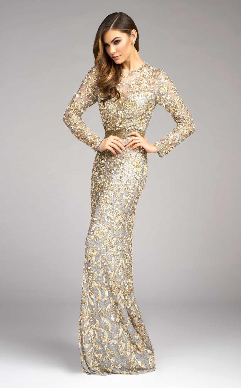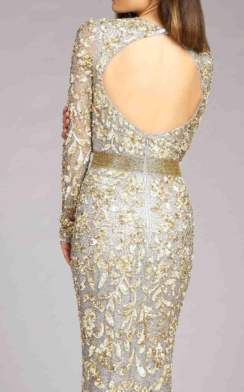 Light up the ballroom at your black-tie event with pure luminous grace in this elegant Mac Duggal Couture 4316D creation. Designed with a trailing vine embellishments festooned in glistening sequins and beads on meshed lace, this beauty shows off a jewel illusion over a sweetheart neckline with slim long sleeves. With a circular open back, this stunner is handsomely cinched with a wide glimmering band. Exceptional sheath skirt in lace flows down divinely to complete at a full-length hem and a subtle brush of train. Showcase your inner brilliance and alluring style in this glamorous Mac Duggal masterpiece. Model is wearing the Platinum/Gold and Black Antique Gold color.