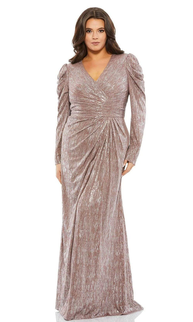 Enhance your visual appeal in this luxurious Mac Duggal 49503. elegant and sophisticated long evening gown features a leg of mutton long sleeves and a V neckline on a bandage-like bodice. It parades a full length column silhouette till it reaches a sweep train. It is designed with shiny streaks allover. Make your perfect day blossom with a promise of forever in this Mac Duggal masterpiece.